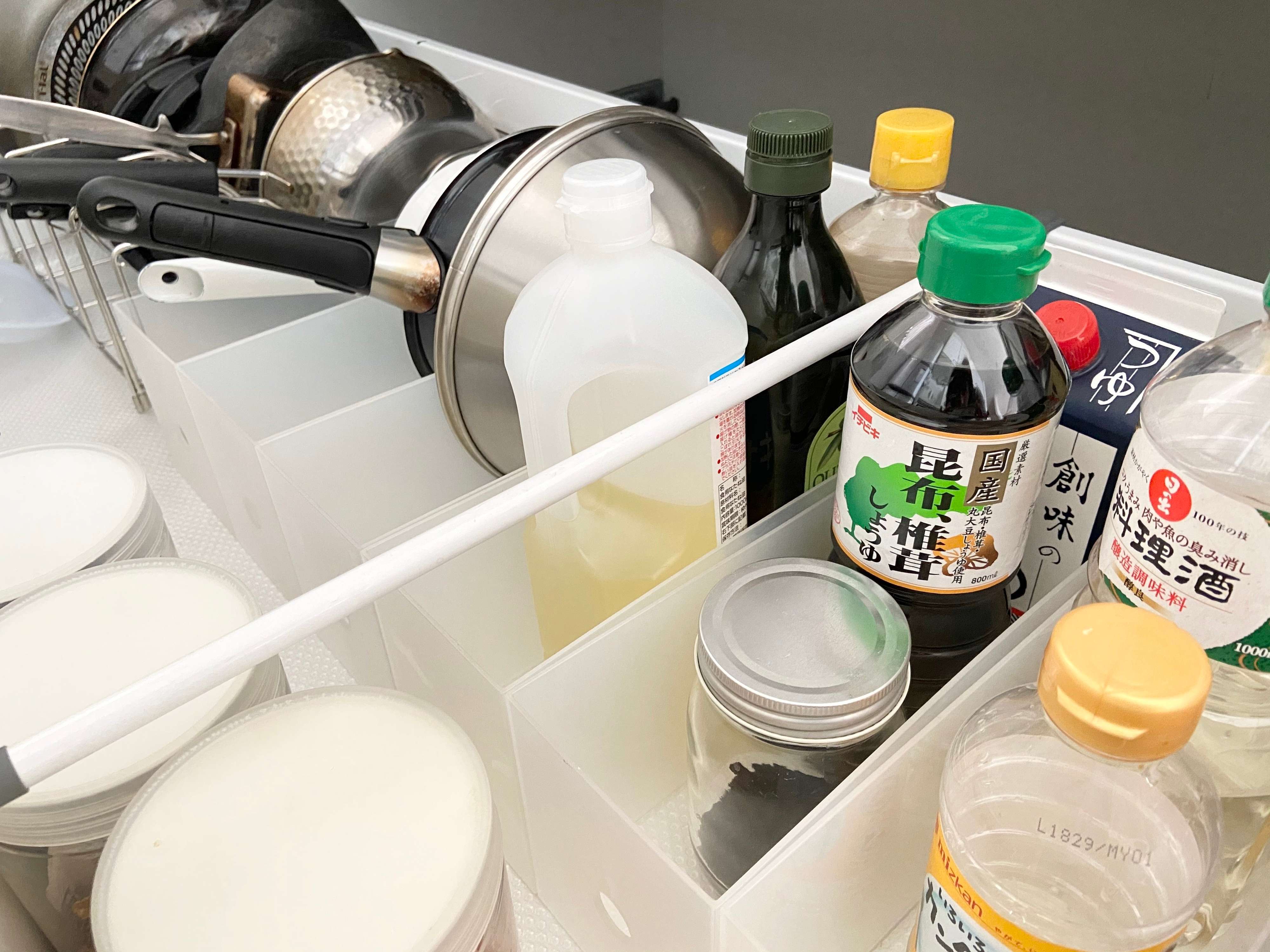 ハーフボックスは中身が見やすくて取り出しやすいのが利点なので、鍋・フライパンやボウル、調味料の収納にとっても便利です。特に取っ手のあるフライパンやお鍋を入れると、取っ手がちょうど取り出しやすい場所にセットできるのでおススメです。