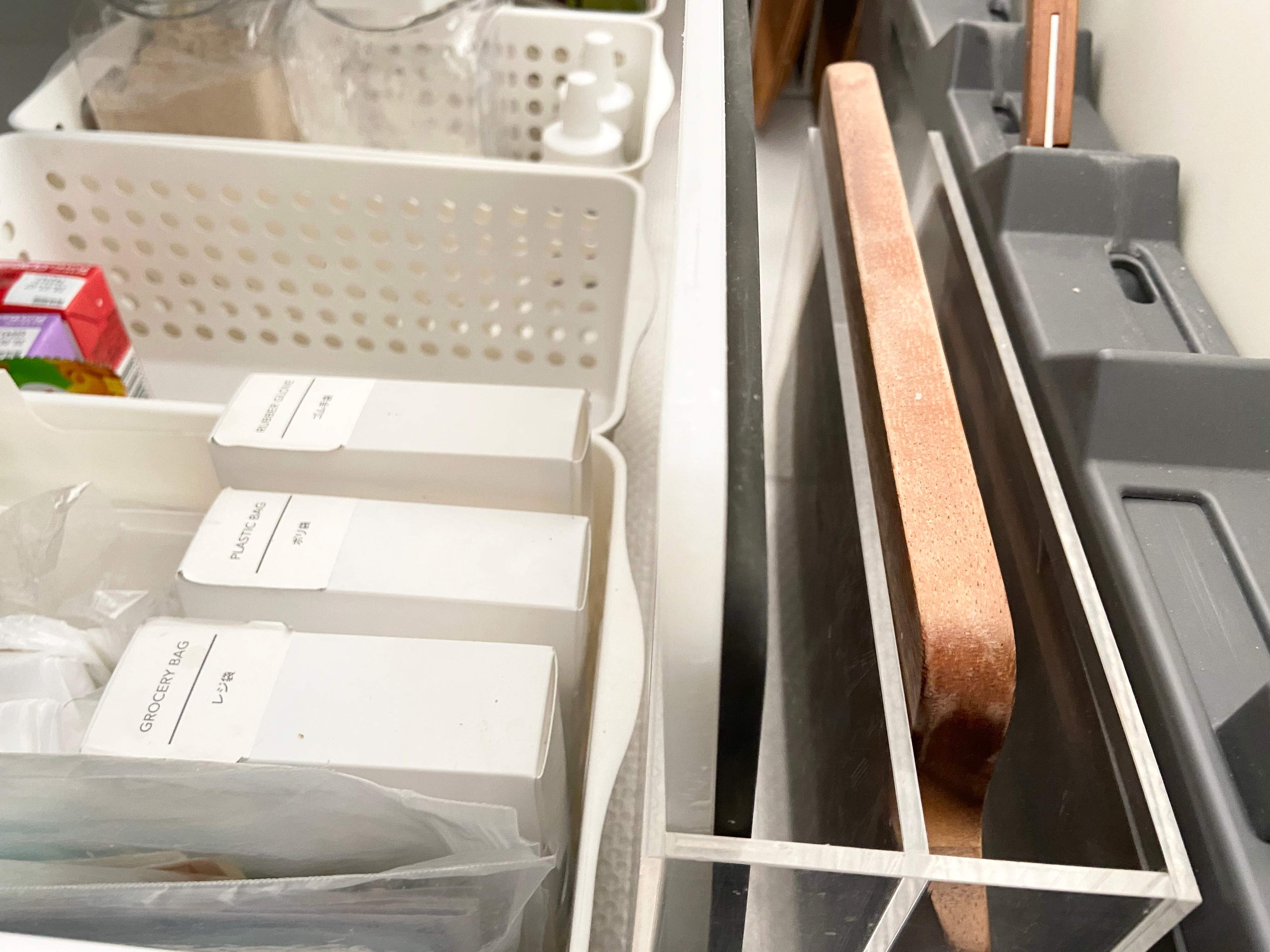 アクリル収納スタンド(幅8.7x奥行17x高さ25.2cm 1,490円)を我が家ではまな板の収納に使ってます。横倒しにするとまな板の収納にぴったりで、かつスリムなので場所を取りません。クリアで見栄えが良いのもお気に入りです。