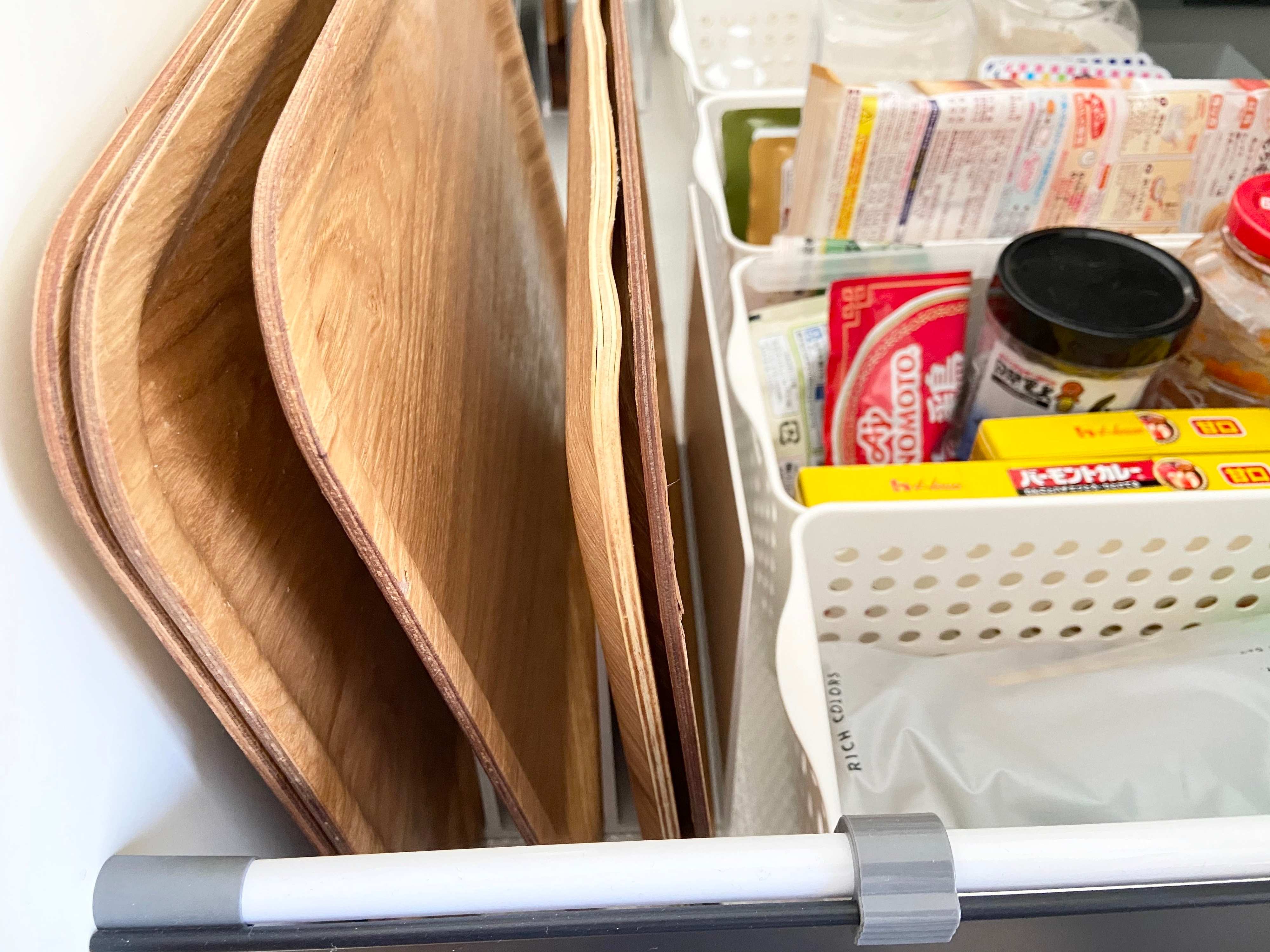 スチロール仕切りスタンド3仕切り・小(税込690円)をお盆の収納に使っています。アクリル収納スタンドよりもプチプラで、カラーもホワイトなので使いやすい収納品の1つです。