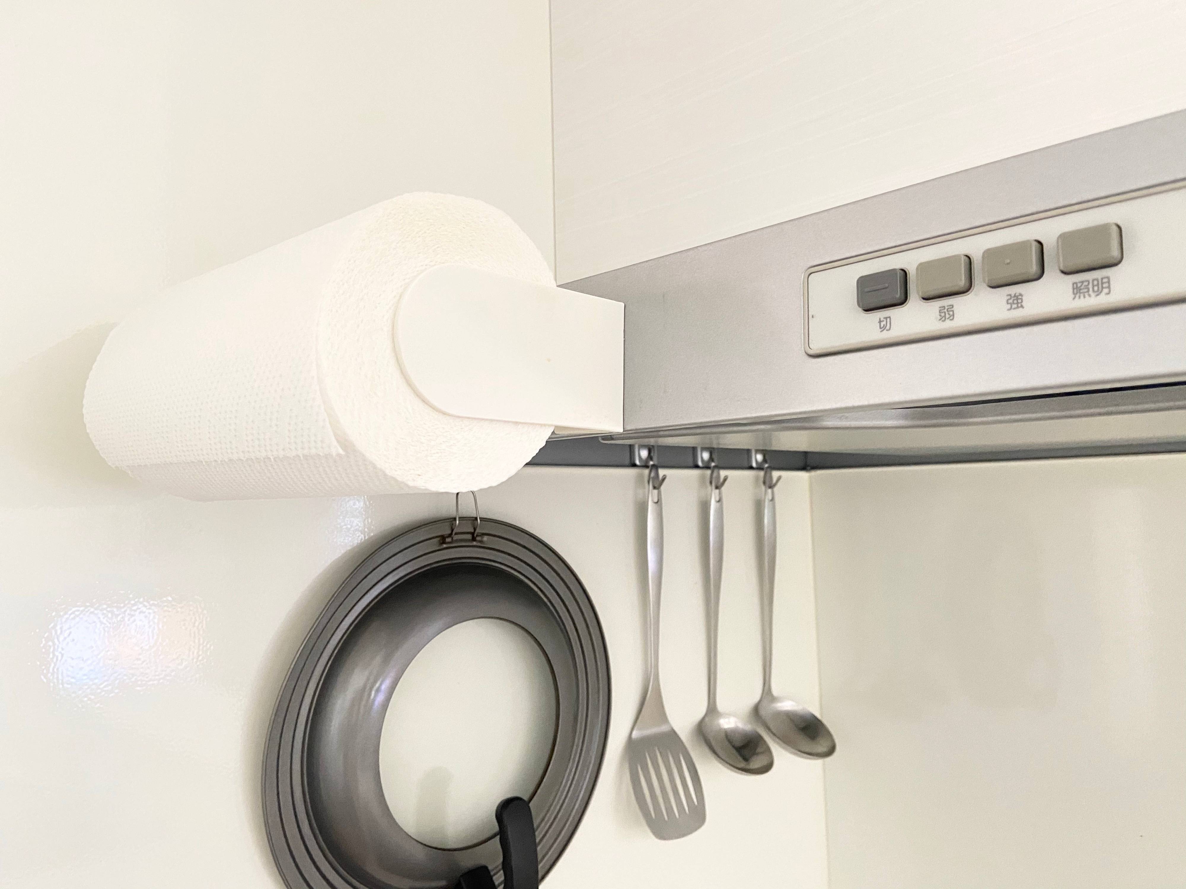 ABSキッチンペーパーホルダー マグネットタイプ (税込490円)をキッチンペーパーの浮かし収納に使っています。こちらレビューでは評価が分かれるところですが、我が家では落ちてくることもなく、ず~っと便利に使っています。