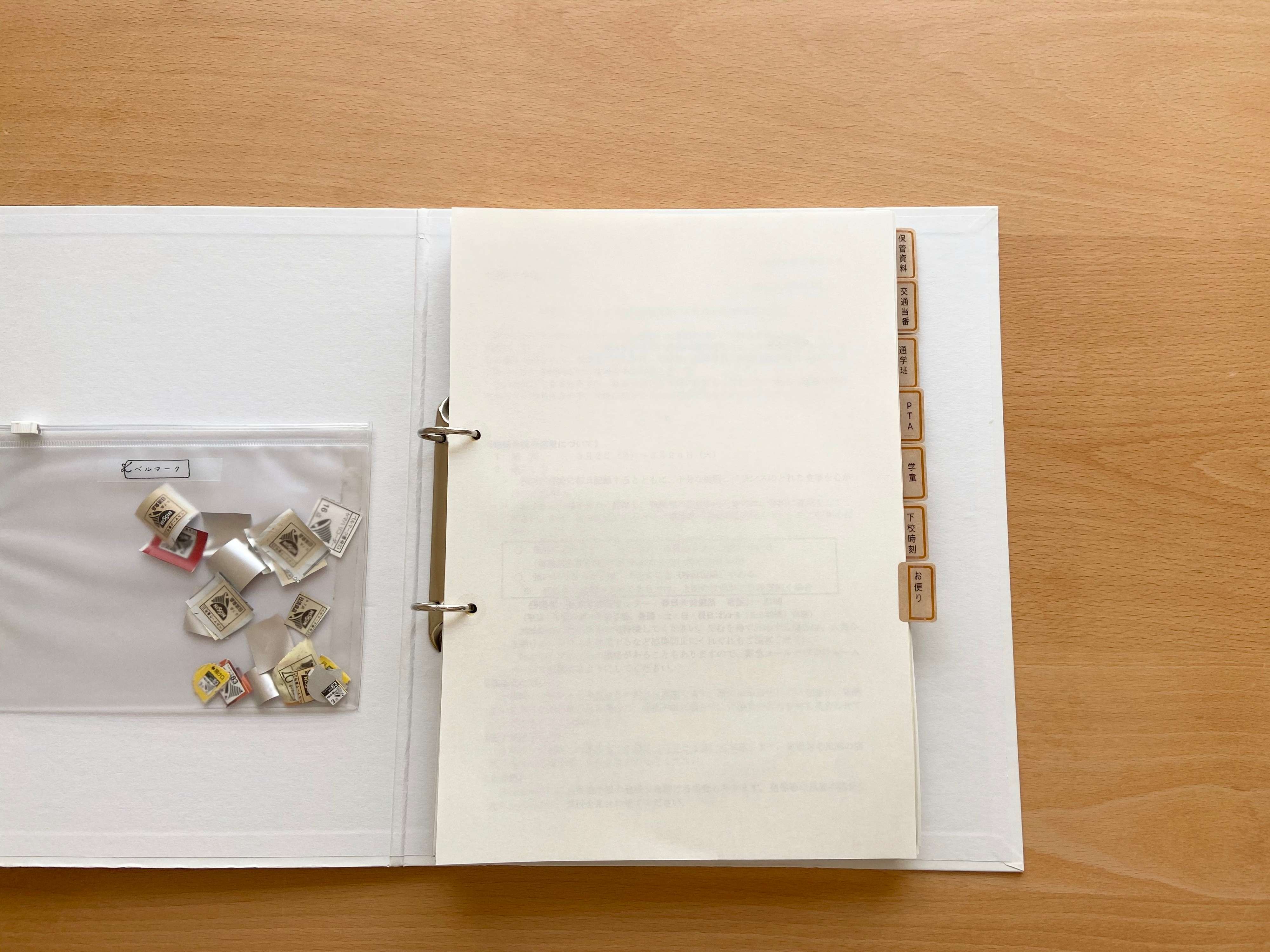 学校に提出するようなベルマークなどはファイルにポケットを貼って集めておくと便利です。家にあったファスナーケースを両面テープで貼ってポケットにしています。最近は100円ショップで貼り付け用のポケットが色々販売されているので、収集したいもや、ファイルとは別管理したいものがあれば、用途に合わせてぴったりものを探してくるのも良いと思います。
