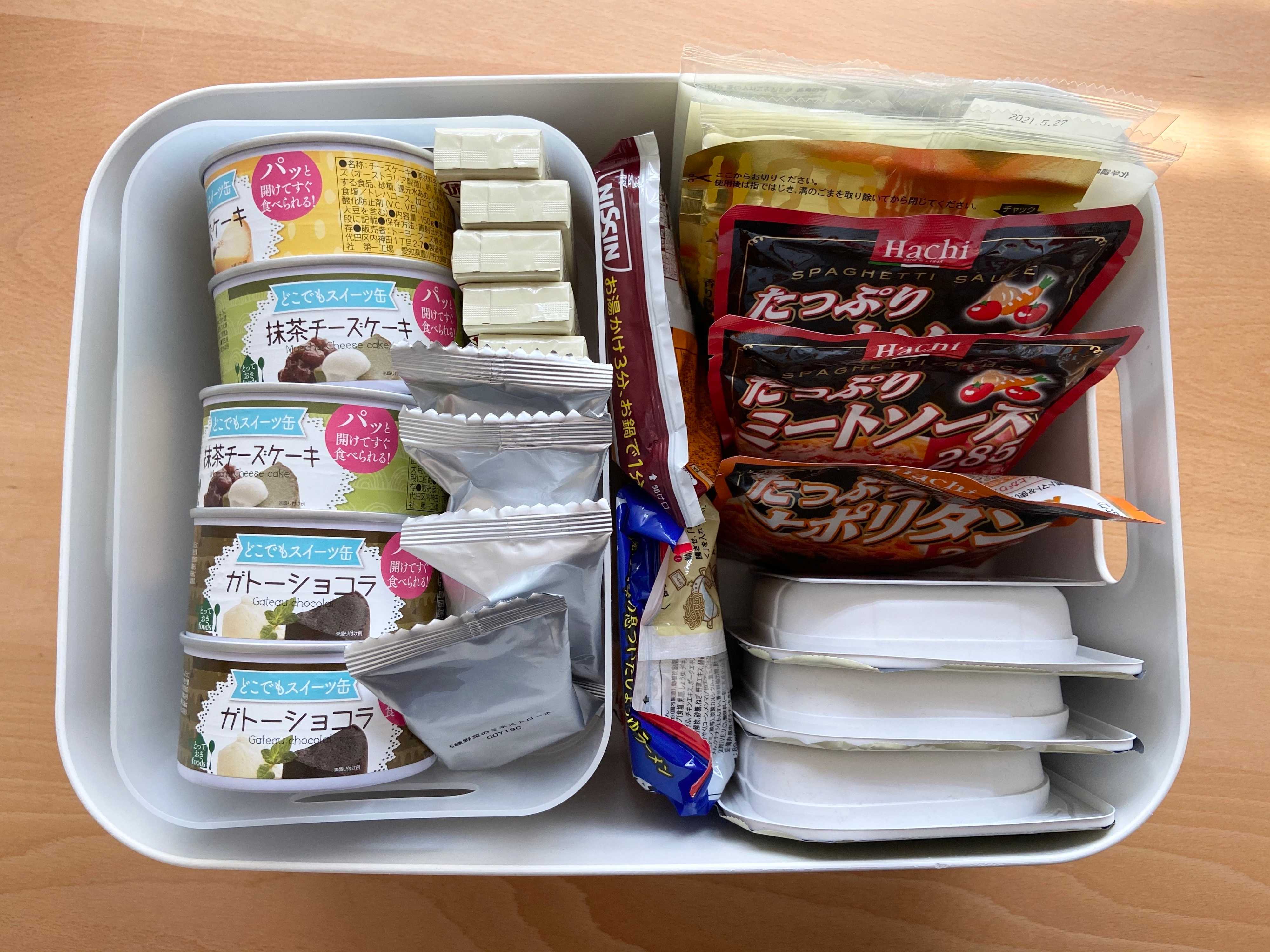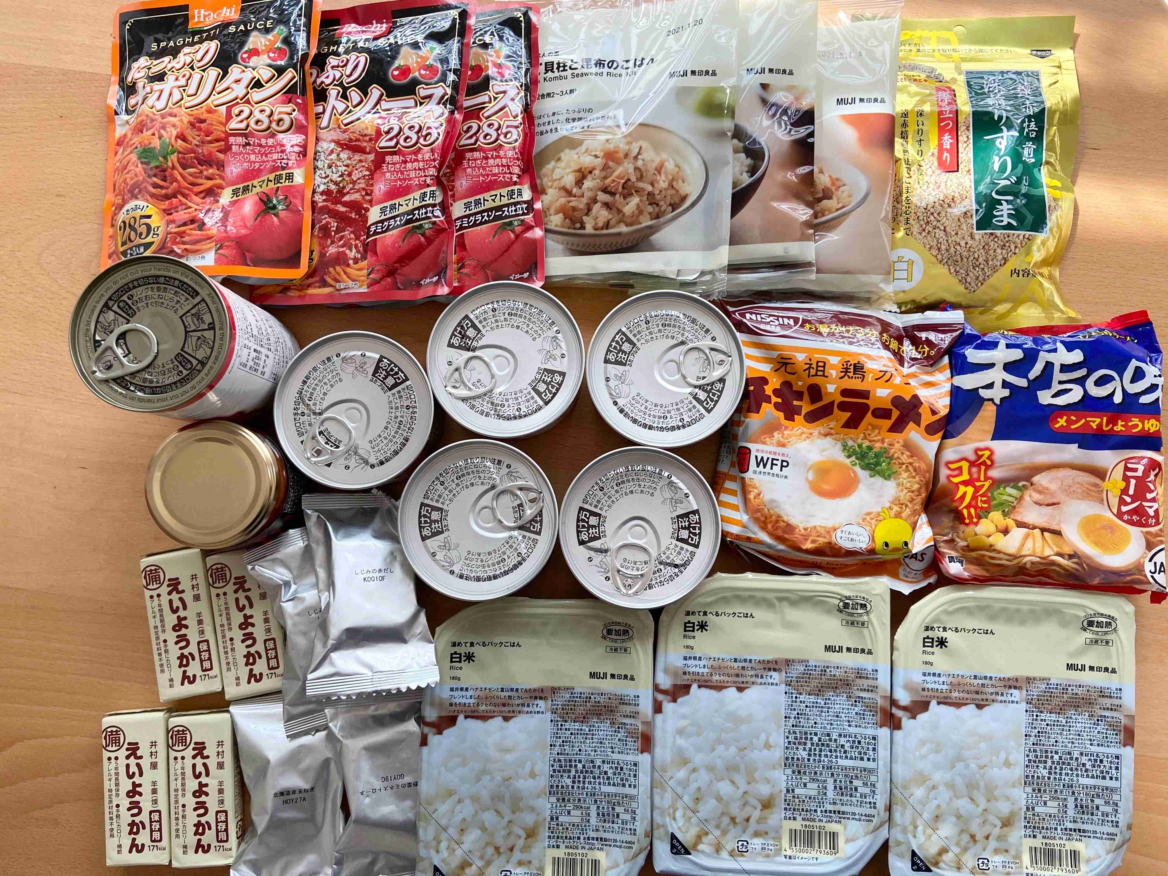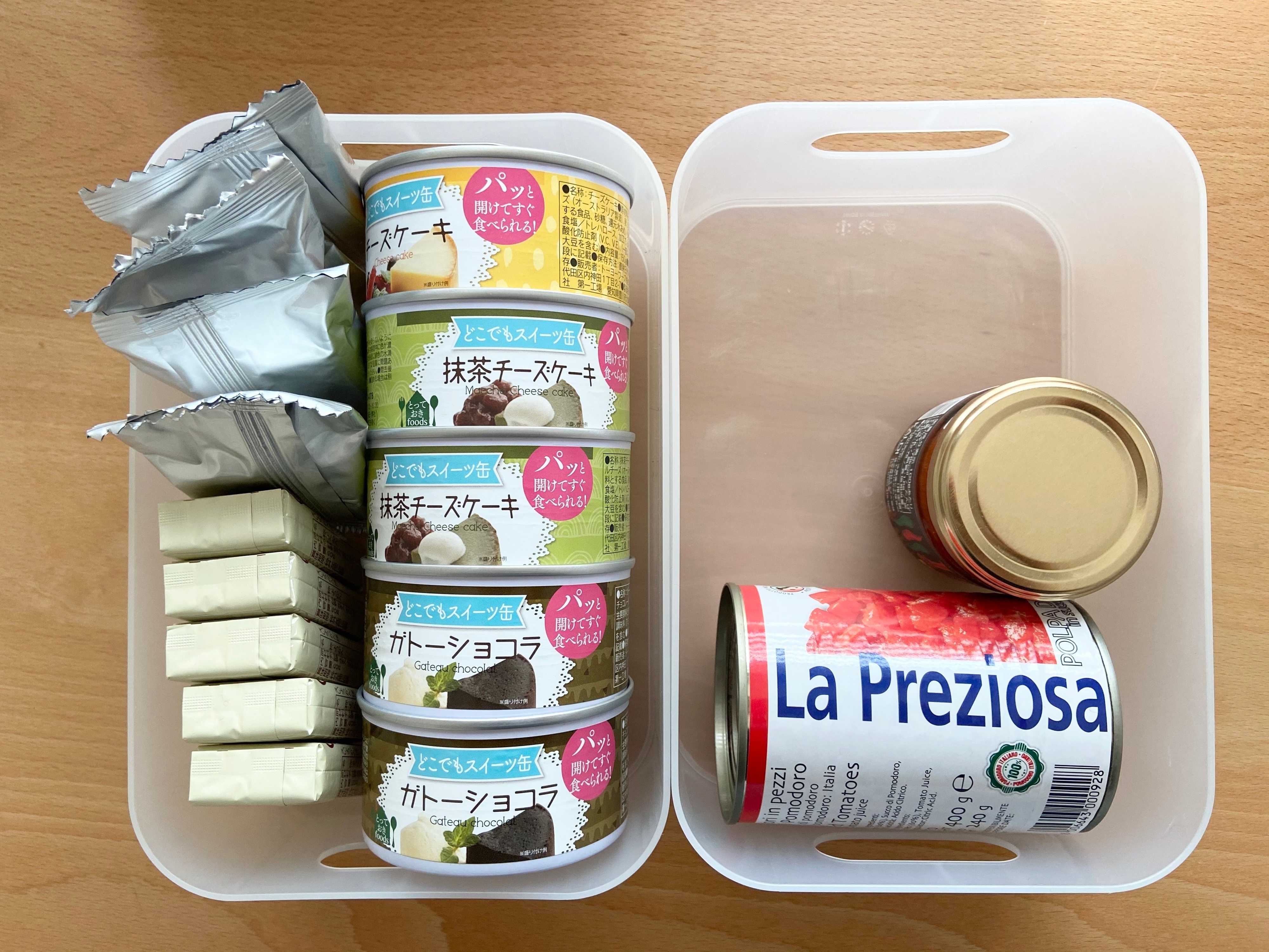 写真を見て見ると、色んな種類のものを1~2個ずつ保管されているようです。ローリングストック用とのことですので、消費しては買い足しをされているということですね。ローリングしているのであれば不要なものは入っていないと思いますが、中身を見て2つお勧めしたいポイントがあります。