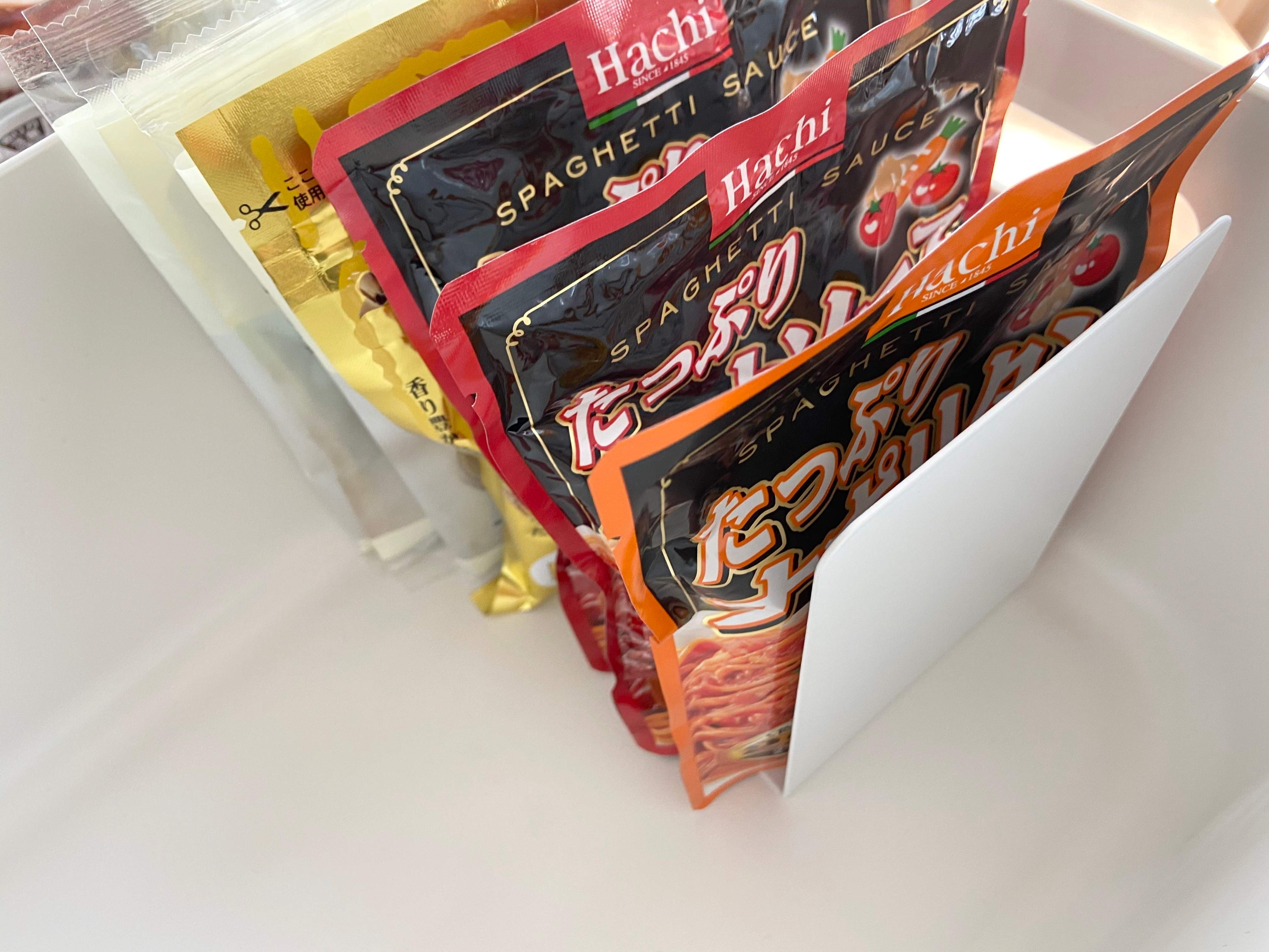 高さがあり倒れそうな食品は仕切りで整頓!