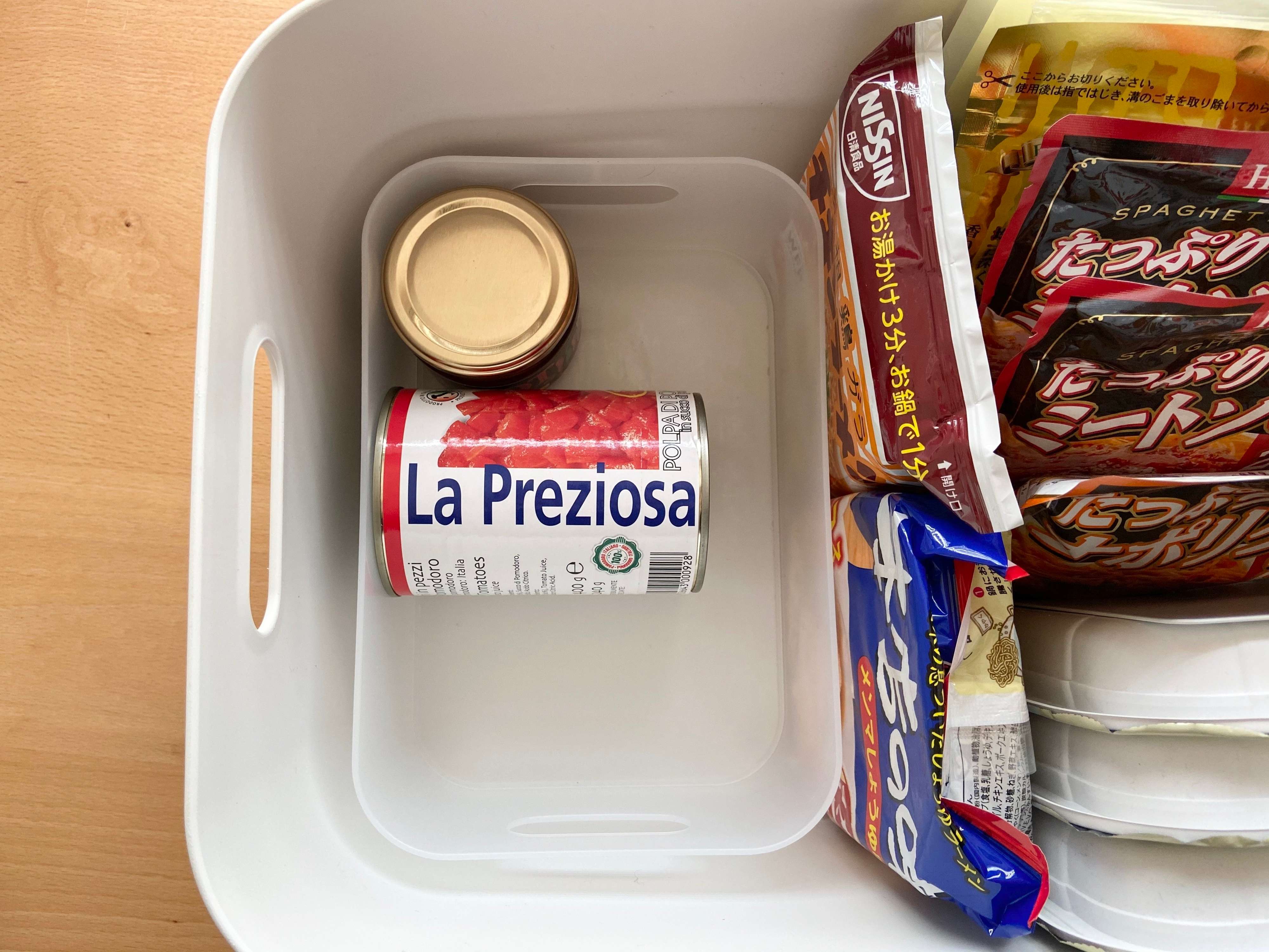 サイズが小さくて埋もれそうなものは、収納ボックスの中に入れて他のものと区切ってあげると良いです。また缶詰は積み重ねるのではなく、ラベルが見えるように横向きに置くのがおススメです。
