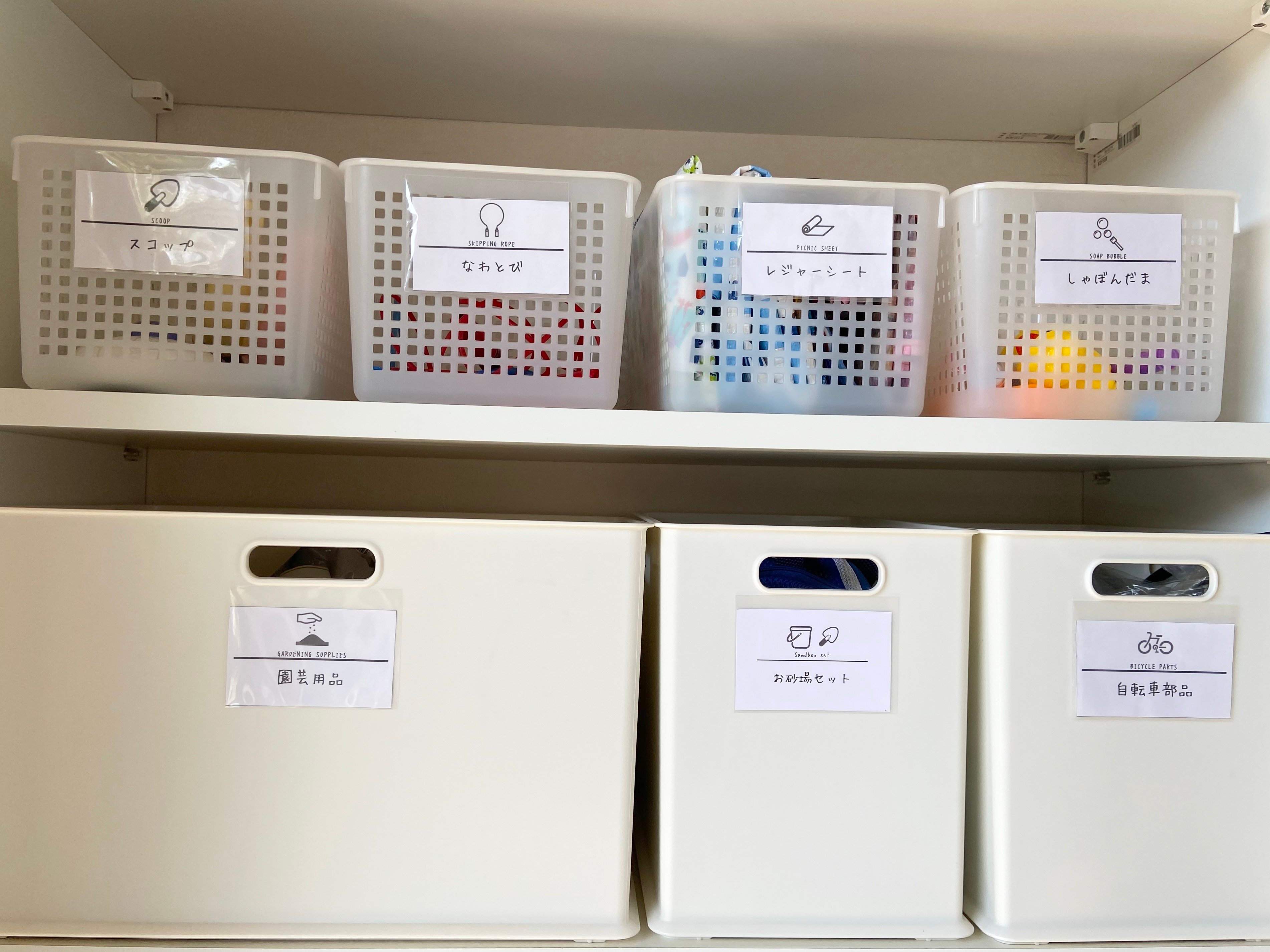 上段の収納は小さ目のケースで同じサイズ・カラーのものを並べるのがおススメです。お子様の年齢が小さい場合は、取っ手付きのものを選ぶとより良いです。その際にフタ付きのケースは選ばないで下さい。ワンアクション増えることで遊ぶ回数が減ることになります。また遊んで使った場合も、フタ を戻してくれるとは考えにくいので結局フタを戻すのはママの仕事になってしまいます。
