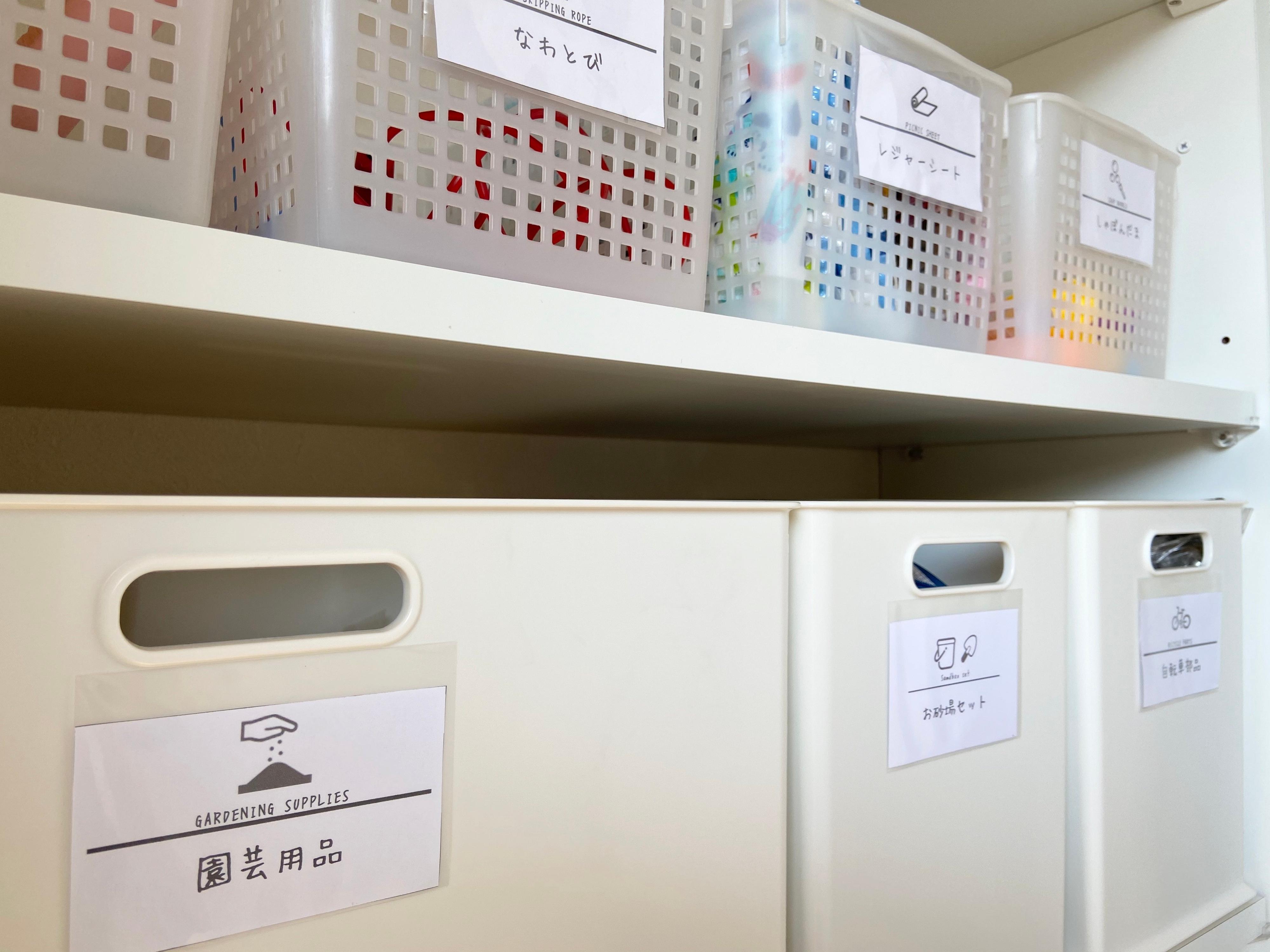 我が家は子どもたちがもう小学生なこともあり、写真を使ったラベリングではなくアイコンと文字のラベリングにしていますが、お子様が小さい場合は写真を使ったラベリングがおススメです。特にニトリのインボックスは中身が見えなくなりますので、すぐにわかるようにしてあげて下さい。