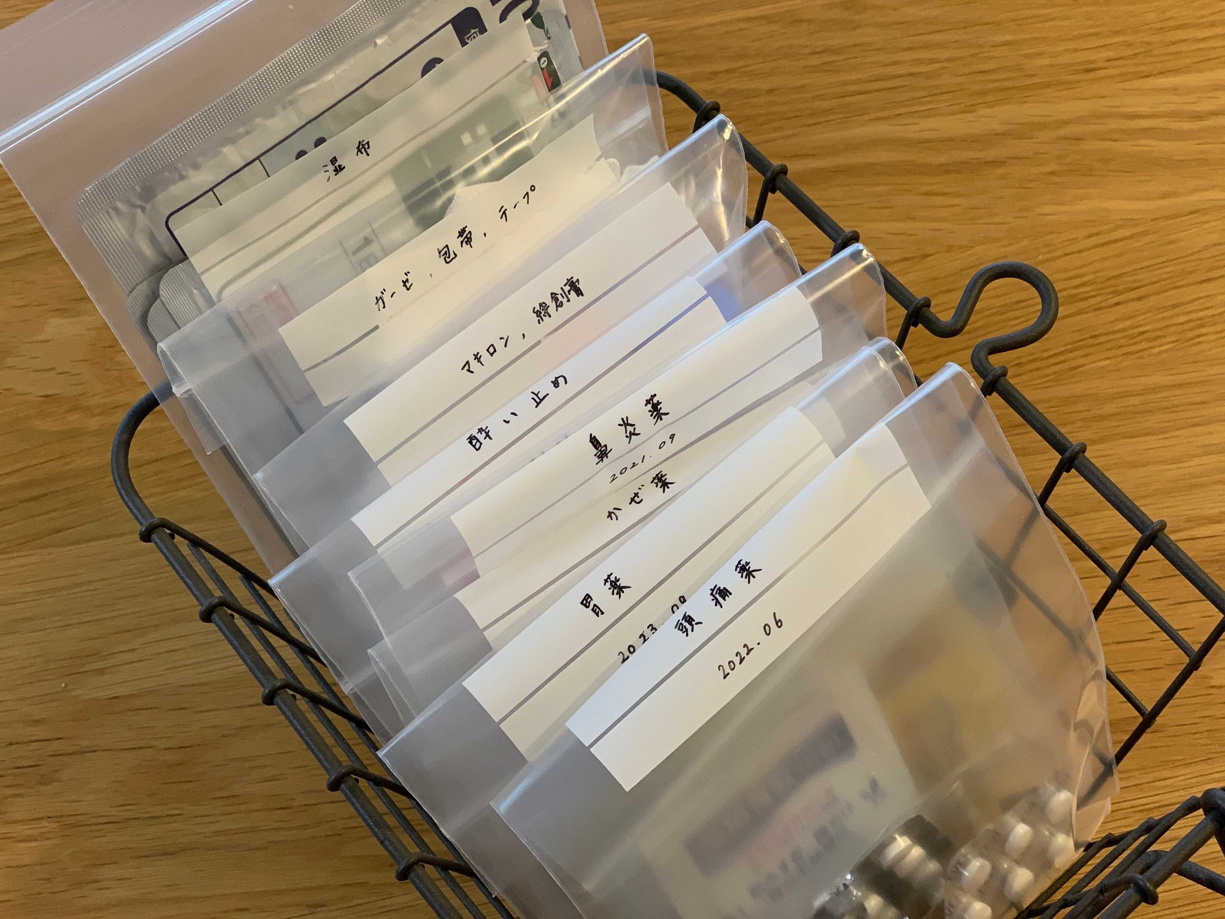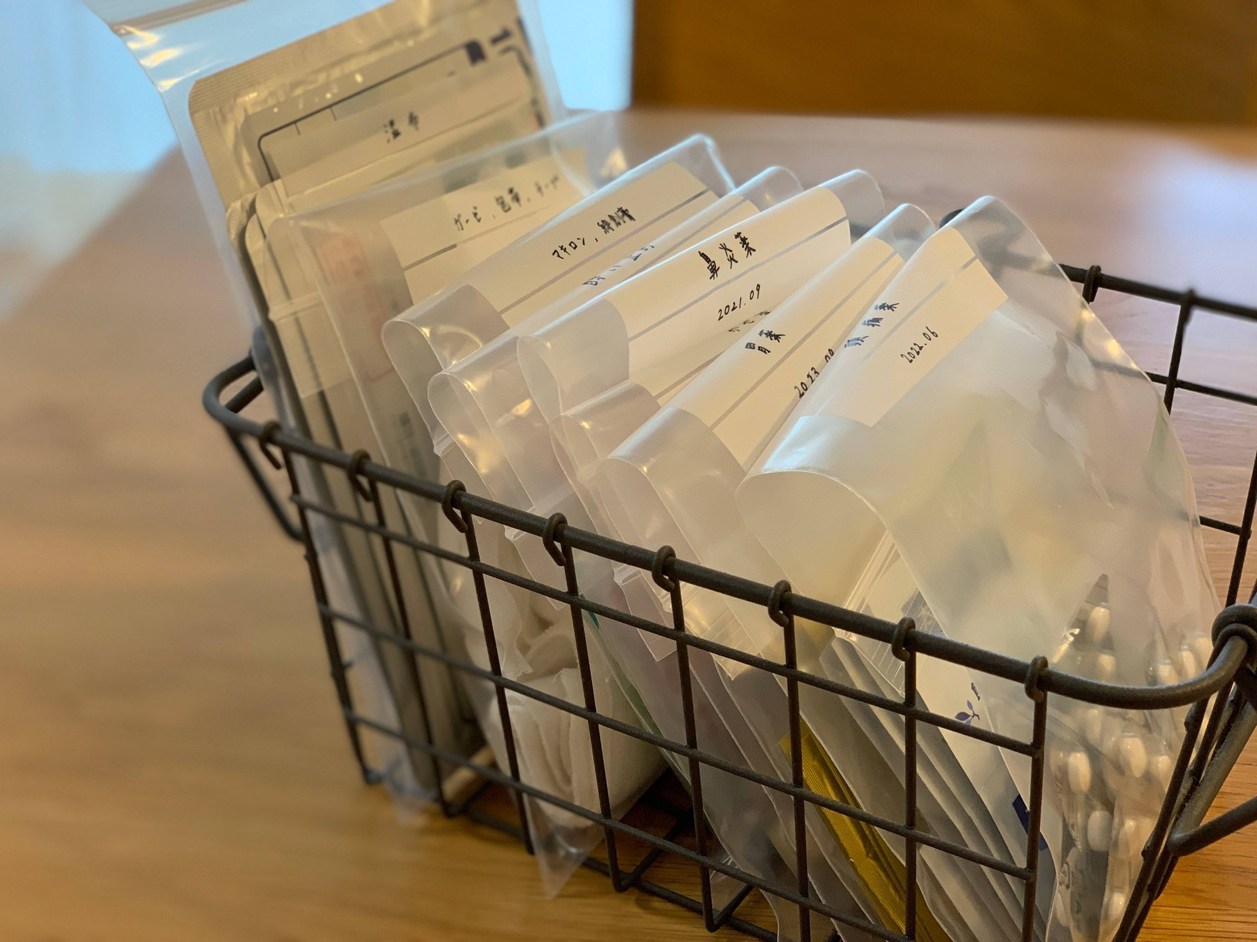 薬の名前が上からパッと見えるので、ガサガサ漁って探す必要もなし。また、薬を箱に入れたままにしておくと、薬があと少しになっていることに気づかず、いざ風邪をひいてしまったときに「あ、薬があと一つしかない!」なんてことになりかねません。その点、この透明な袋に入れておけば、残数が一目で分かるので安心です。