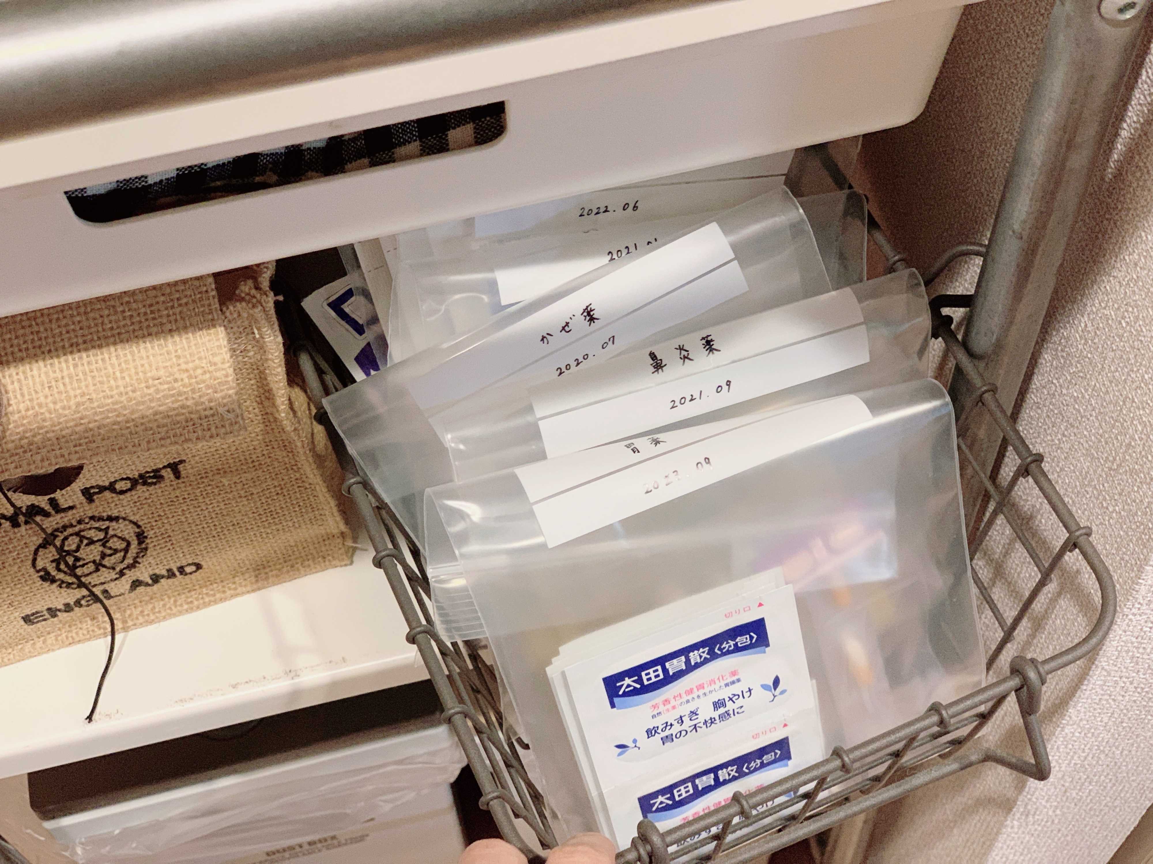 我が家では、このカゴをキッチンの棚に置いています。以前は、洗面所に置いてあったのですが、ズボラな筆者は、飲むときに出してきた薬の袋を、飲んだ後もキッチンに置きっ放しにしてなかなかしまわない…ということが度々あったため、キッチンへ移動しました。