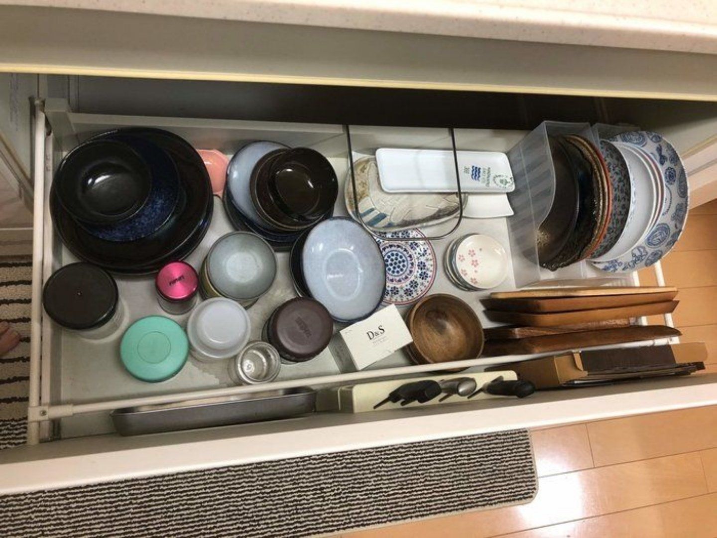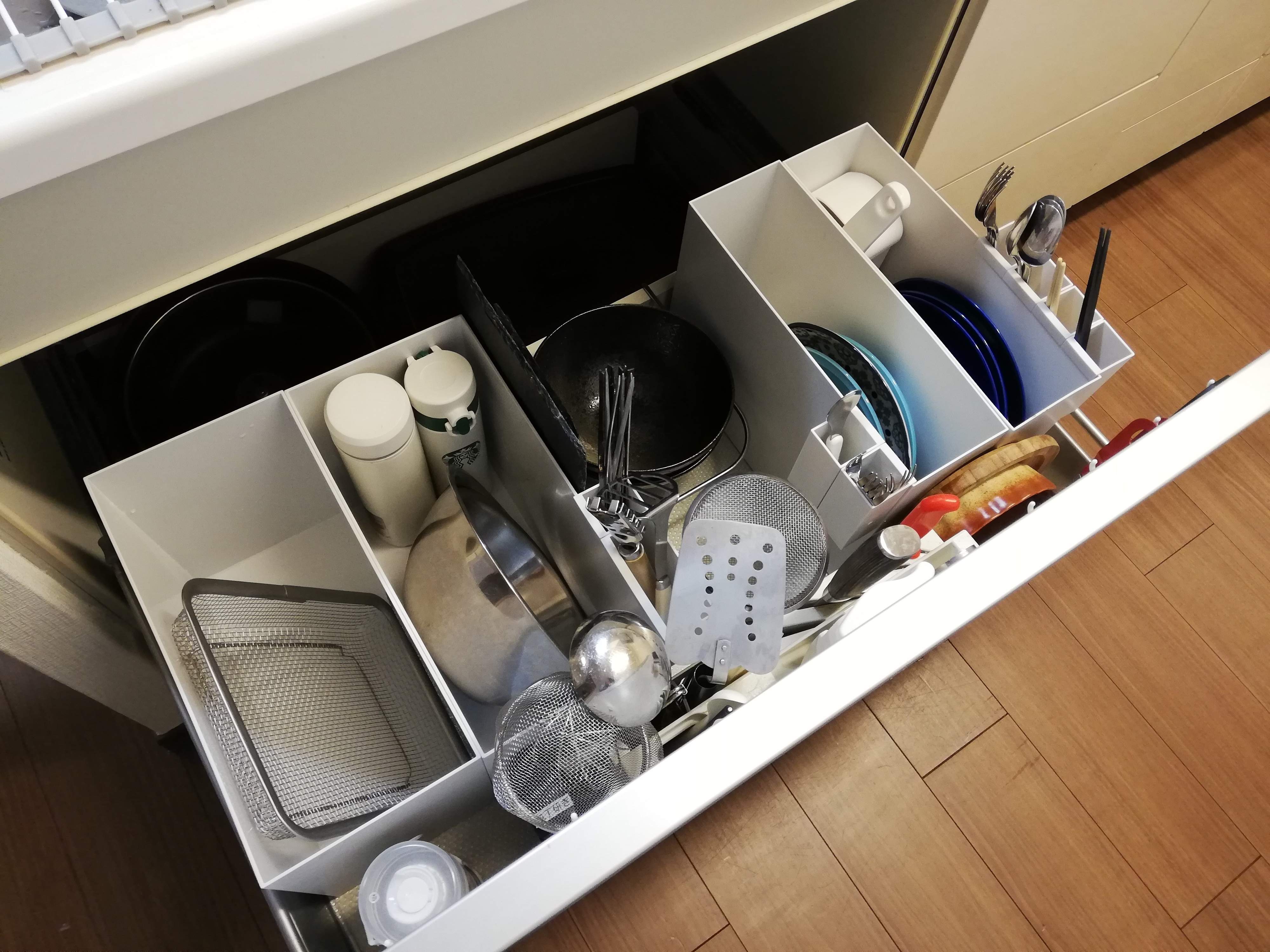お悩みポイントでもある通り、ここのキッチン引き出しは深くなっており、ファイルボックスに立てて収納されているお皿以外は、しゃがまないと出し入れできないんです。