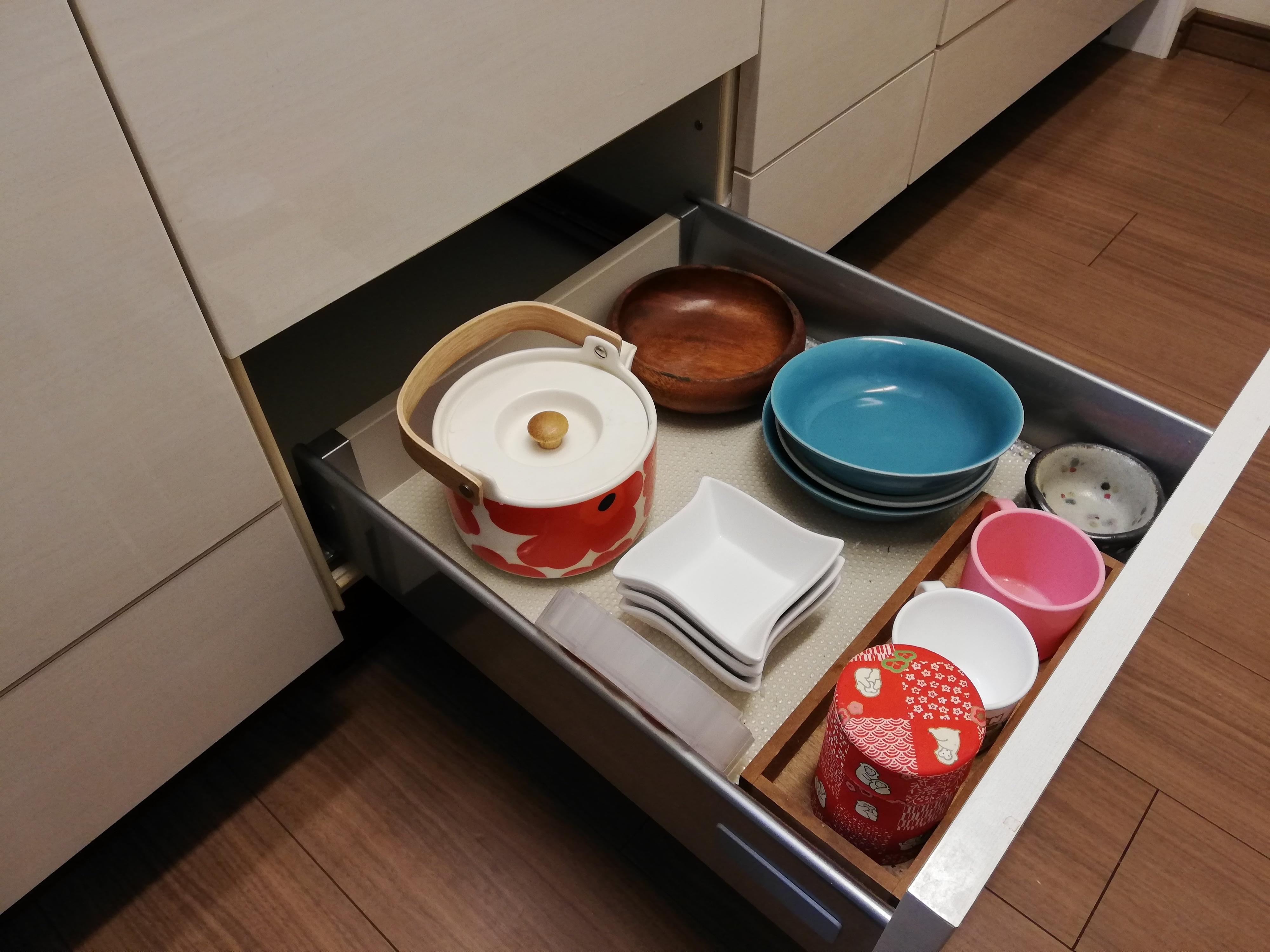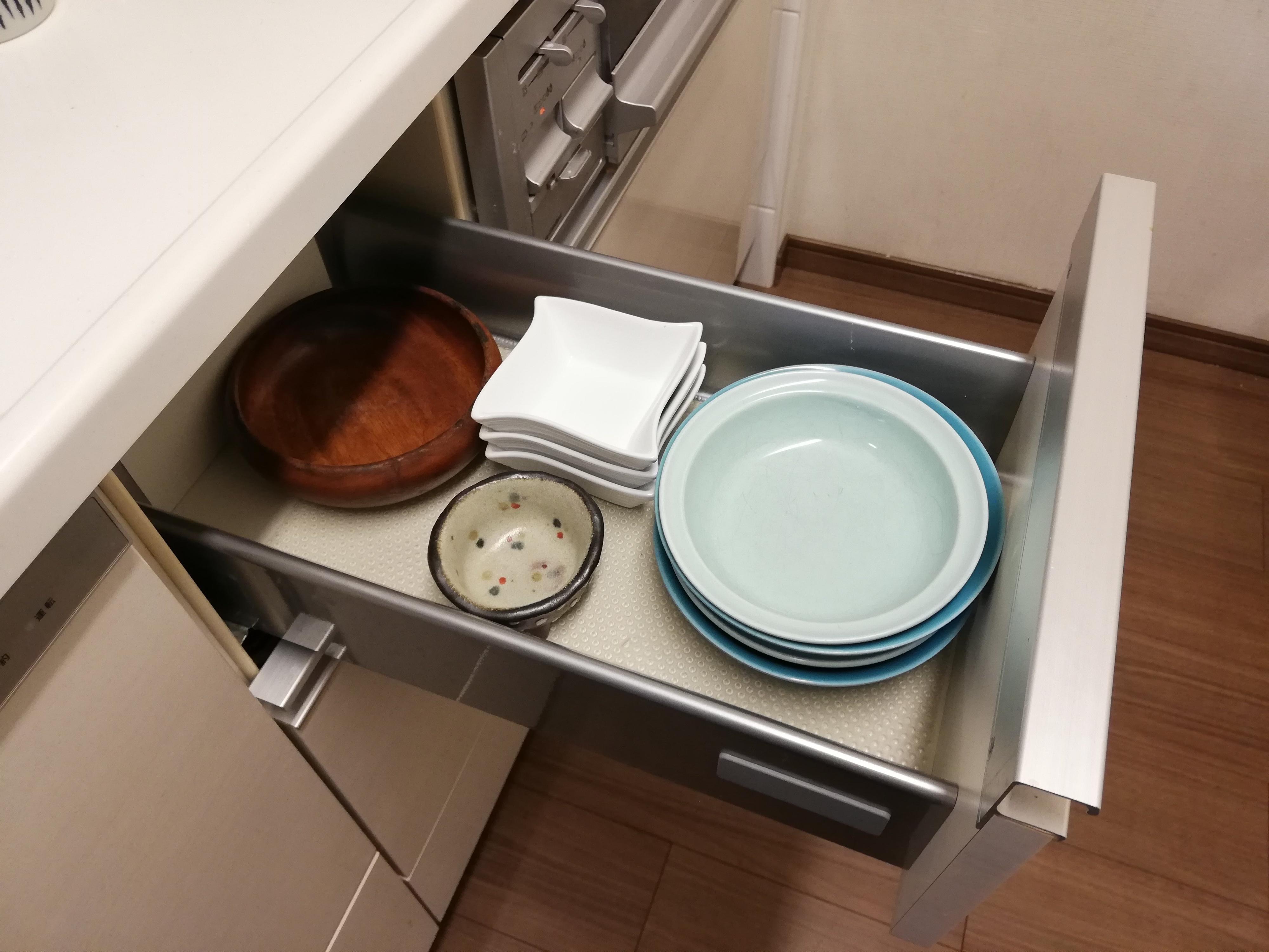 今回のこちらの画像を見る限り、専用の背面食器棚ではなくキッチン下の引き出しを食器棚代わりとして使っていることが分かります。