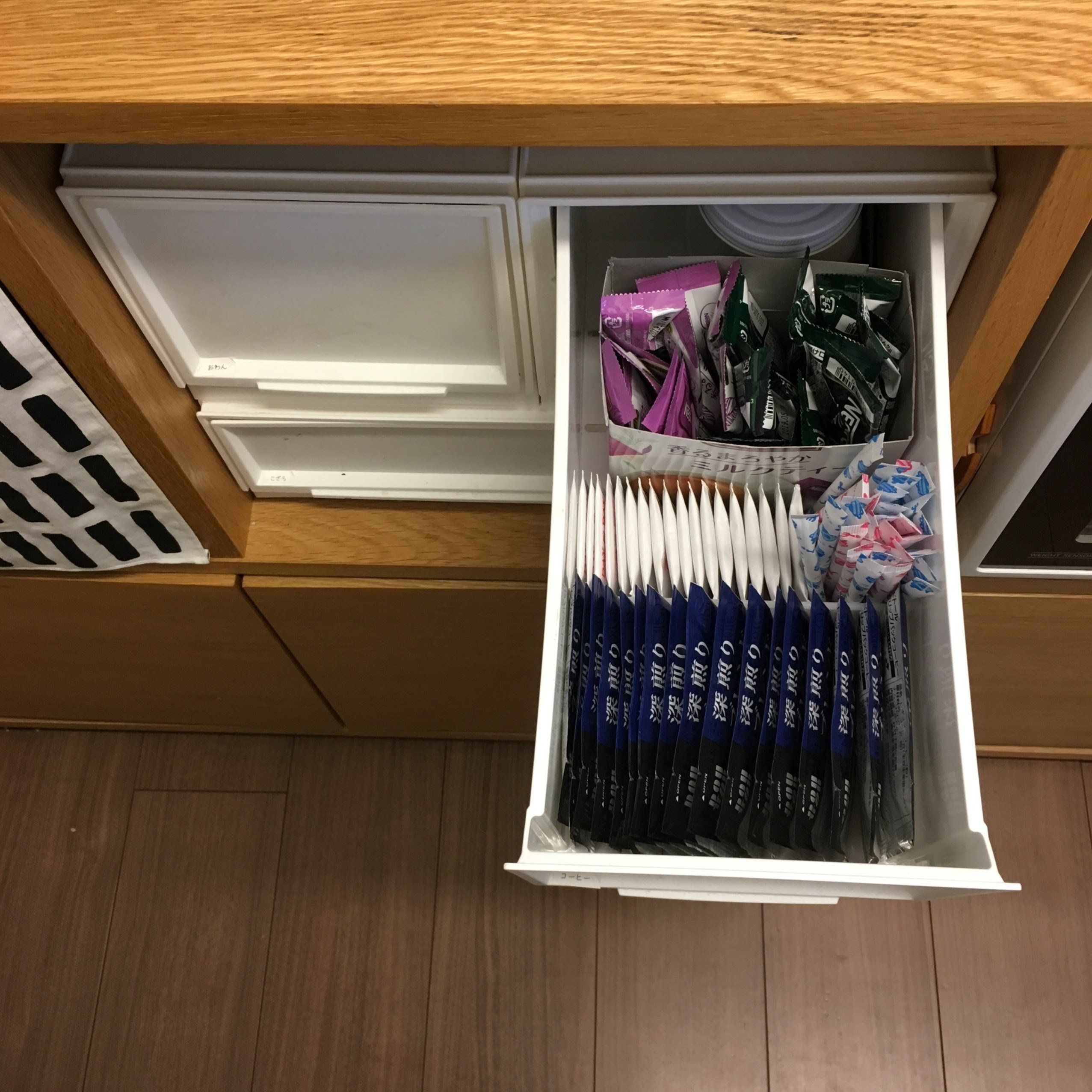 頻度が高く、大人がよく取り扱うお茶碗と味噌汁だけは、ニトリの「マルチボックス」に収納しています。