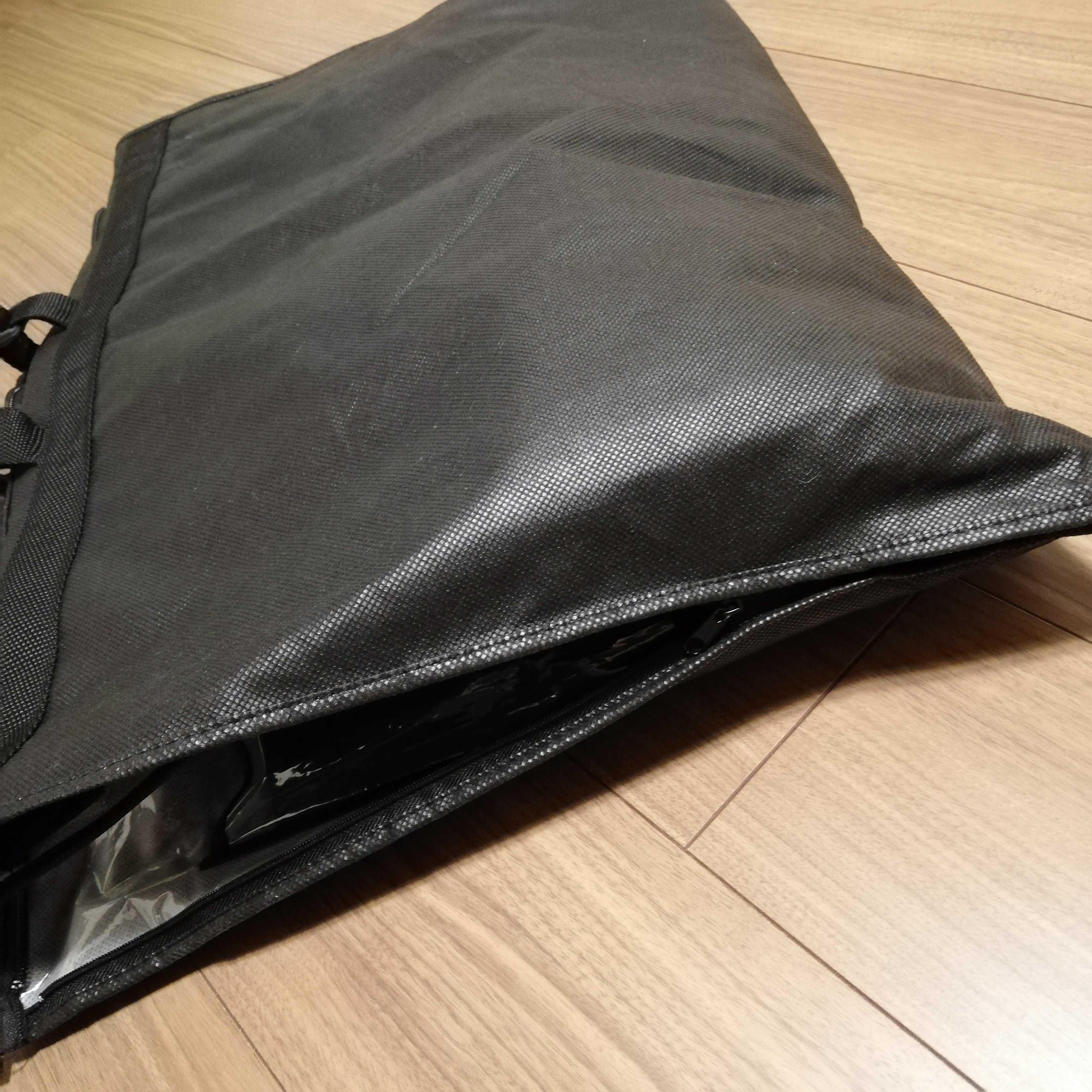 軽く三つ折りにしてサイドにチャックがついており、コンパクトになりました。