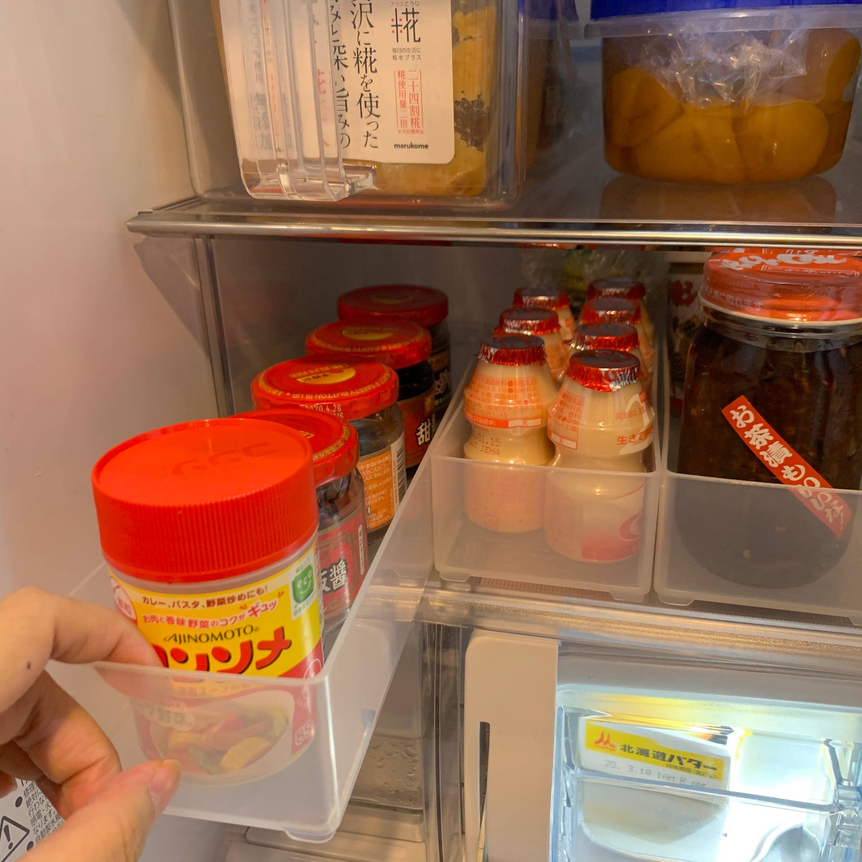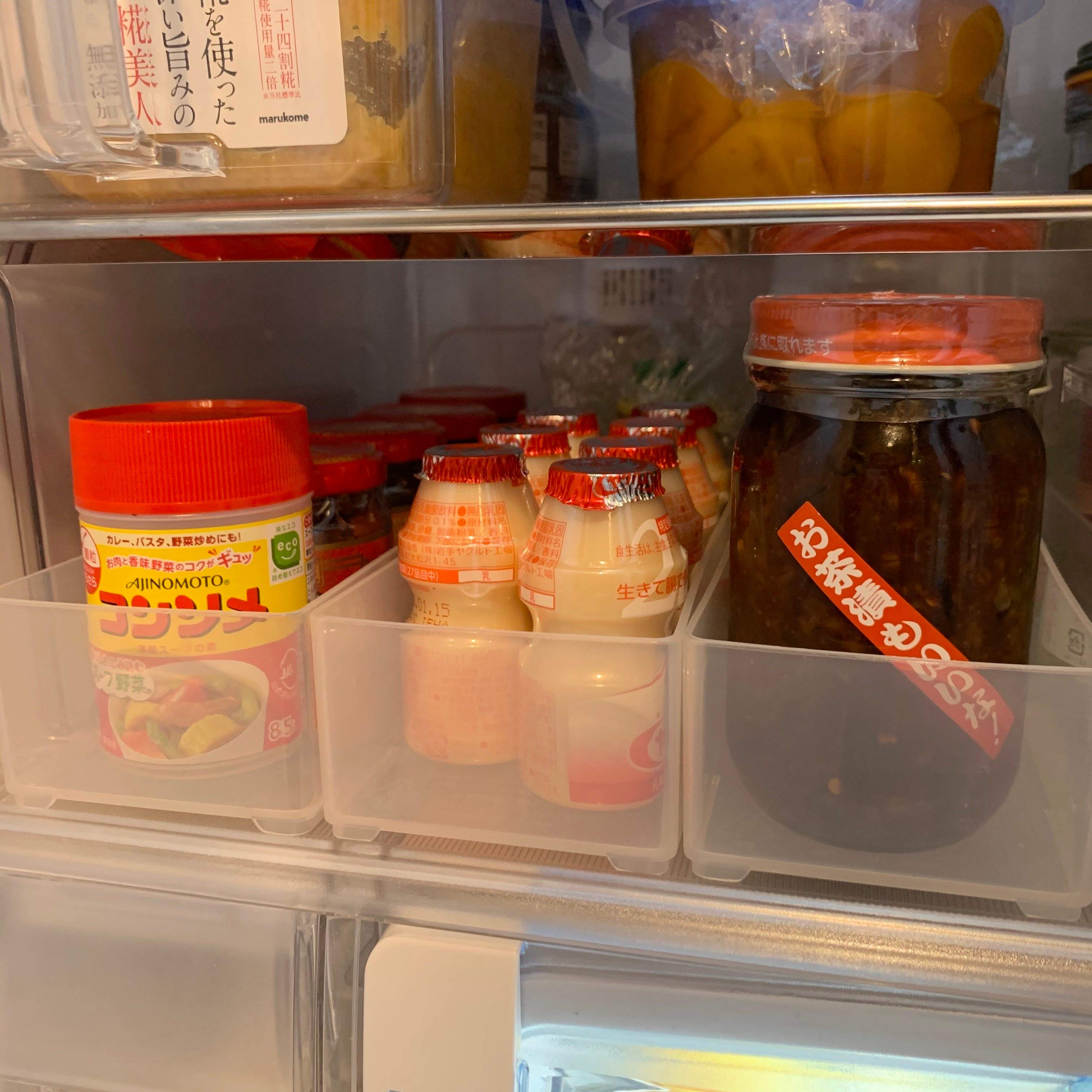 調味料の瓶や、ヤクルト(絶賛腸活中)、ご飯のお供などなど、形の違う小さな容器が大量にあると、それだけで冷蔵庫がごちゃっとしてしまいます。そういったものは、全部まとめて縦長のトレーに収納しましょう。