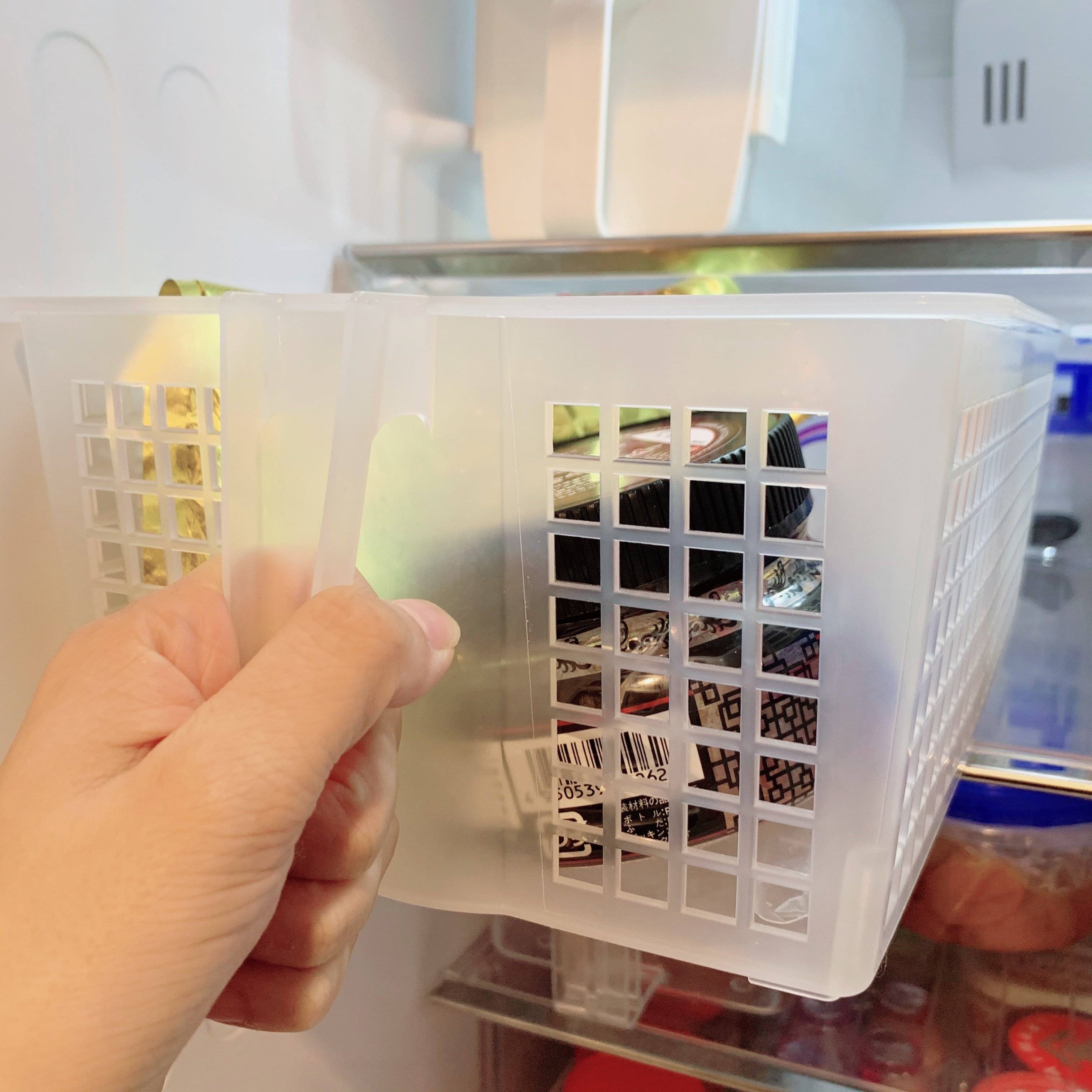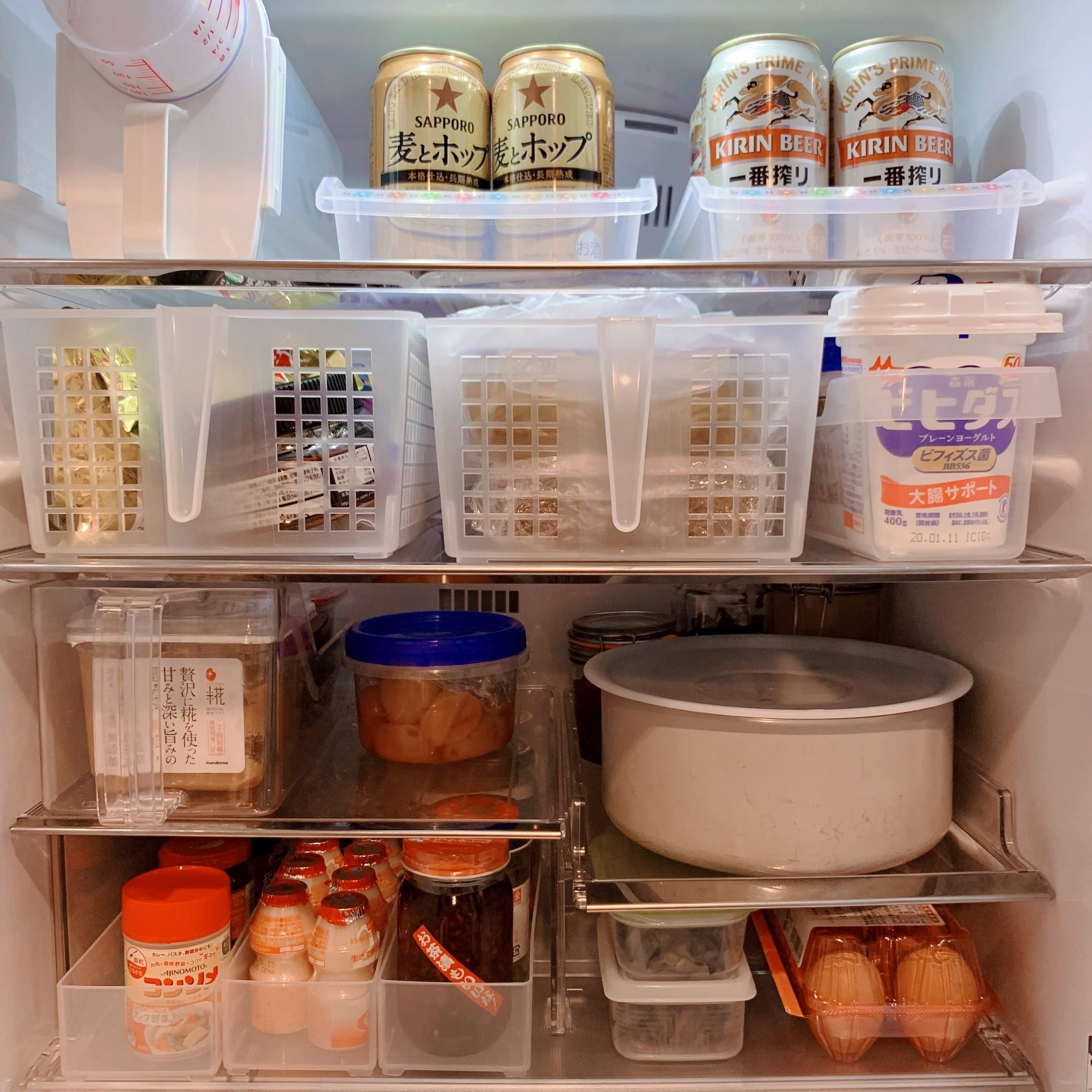 冷蔵庫の上段は、女性だと取り出しにくいですよね。取っ手付きのかごやトレーに収納すれば、出し入れラクラク!これで、上段の奥までフル活用できます。