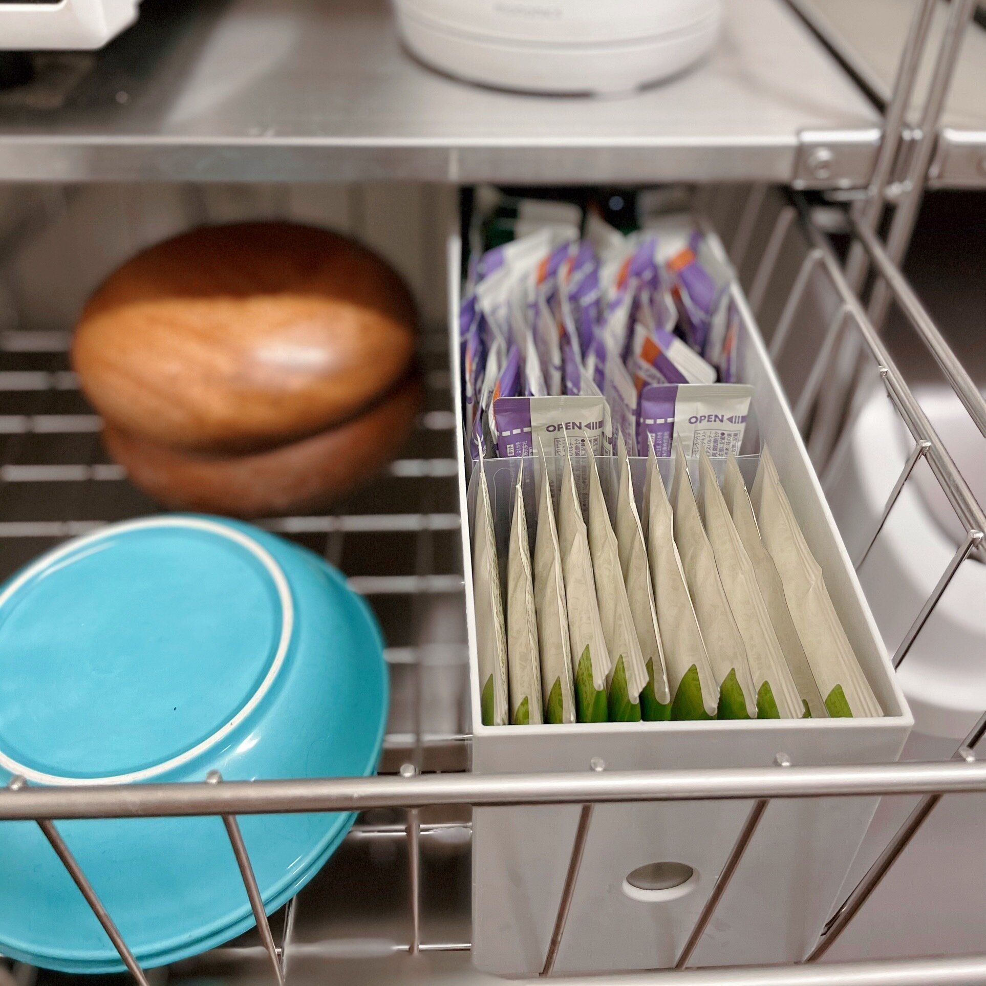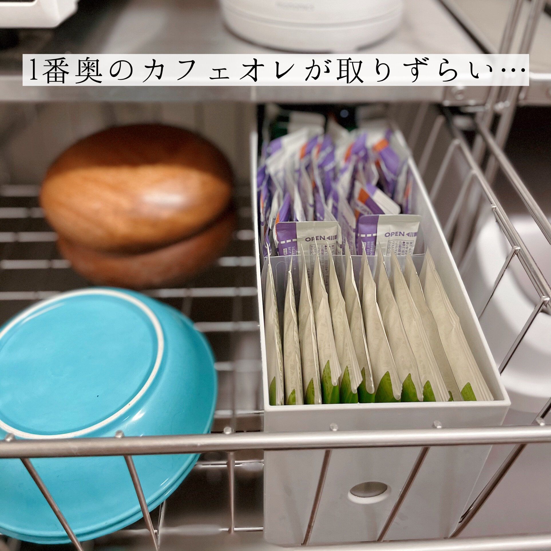 ワイヤーバスケットは奥まで引き出せない為、スティックタイプのカフェオレが取り出しにくくなってしまいました。