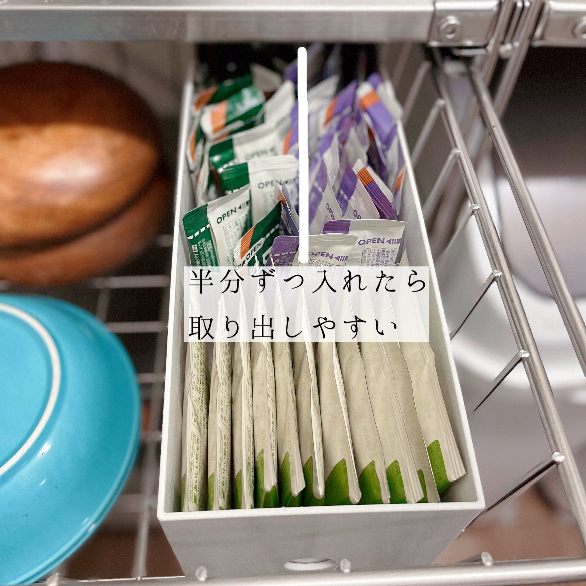 どちらも取り出しやすいように、半分ずつ入れてみることにしました。