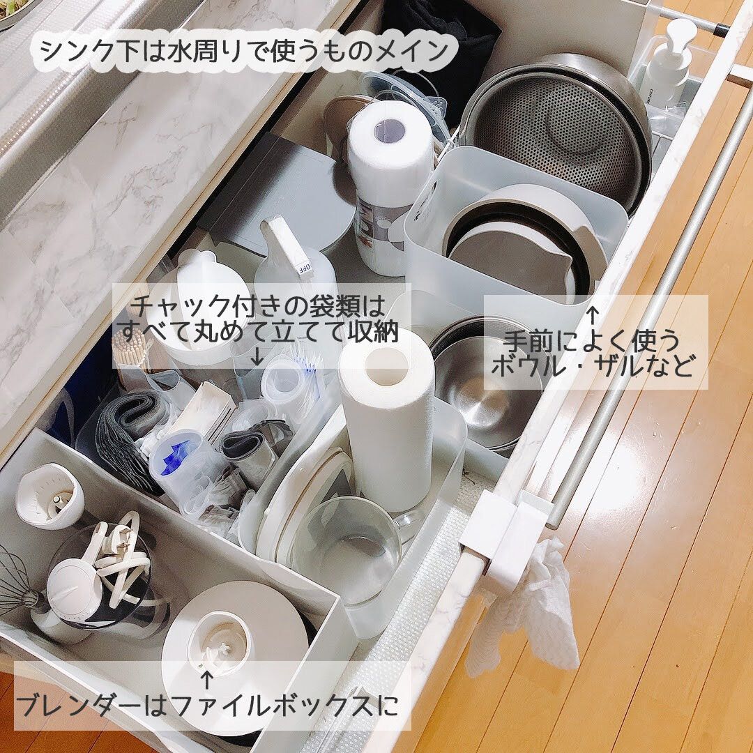 チャック付きの袋もボウルやザルも、立てて収納しておくと省スペースでわかりやすく、出し入れもしやすくなります♡