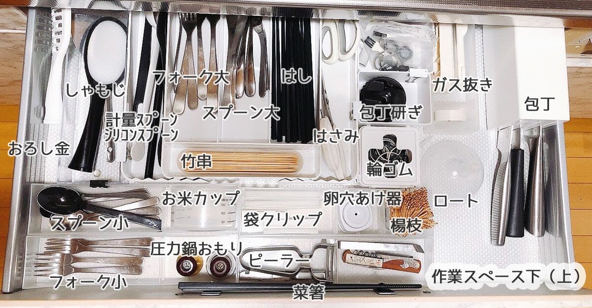 カトラリー類や調理ツールを細かく仕切った上段へ。