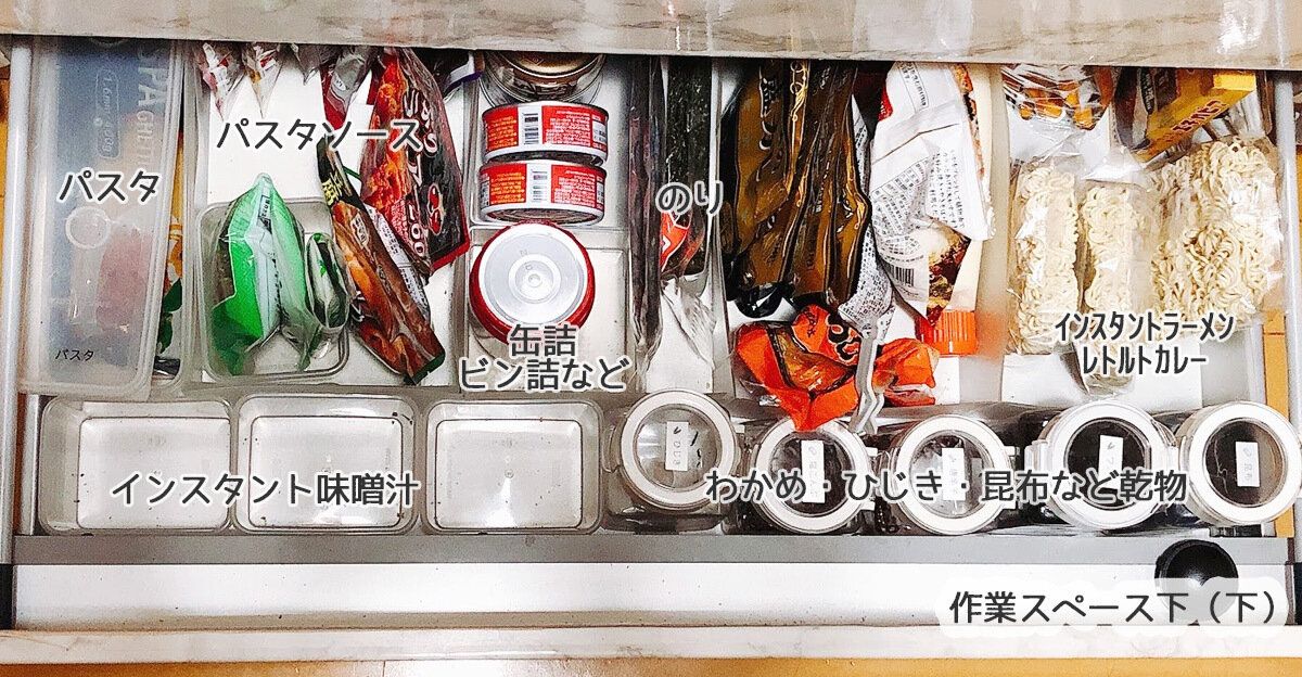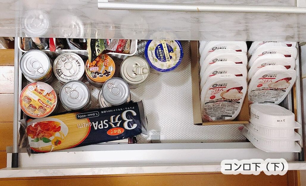 下段はちょっと使いにくい場所なので、ストック食品収納に。