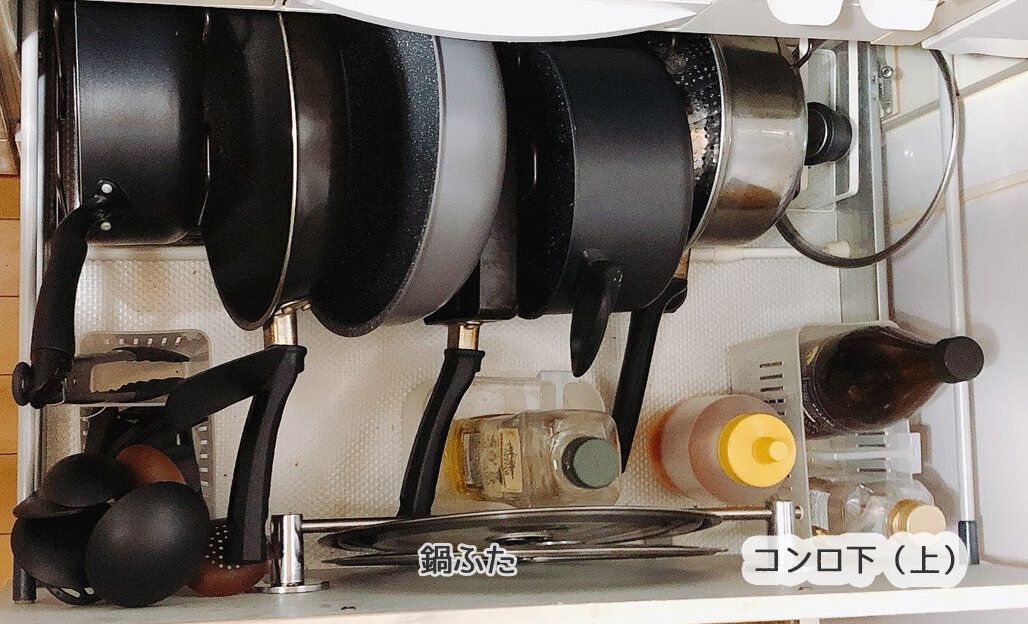 上段は王道の鍋収納として使っていますが、油や背の高いお酢もここに。