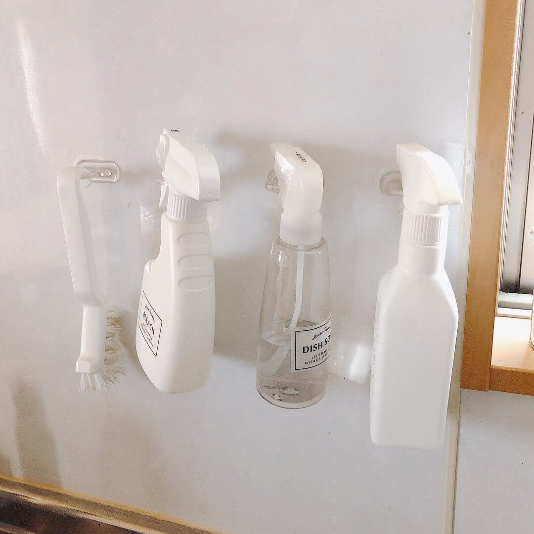 頻繁に使う泡ブリーチ、除菌アルコール、排水口用のブラシはシンク前の壁にかけて収納しました。