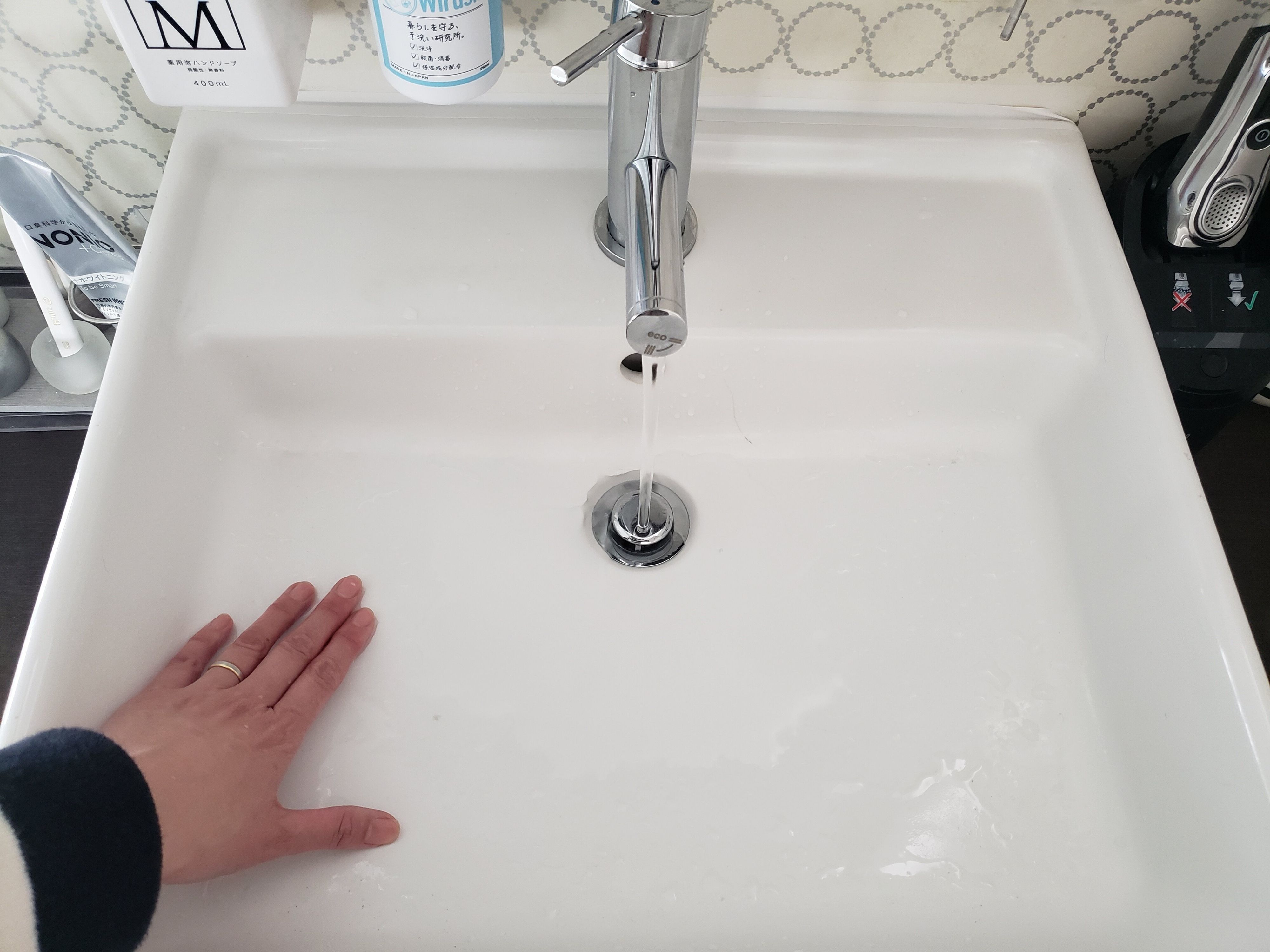 洗面台をキレイにキープする方法は、洗剤やスポンジ類は必要ありません!手を洗うついでに洗い流す前に洗面ボウルを擦るだけ!これだけでキレイは続きます!