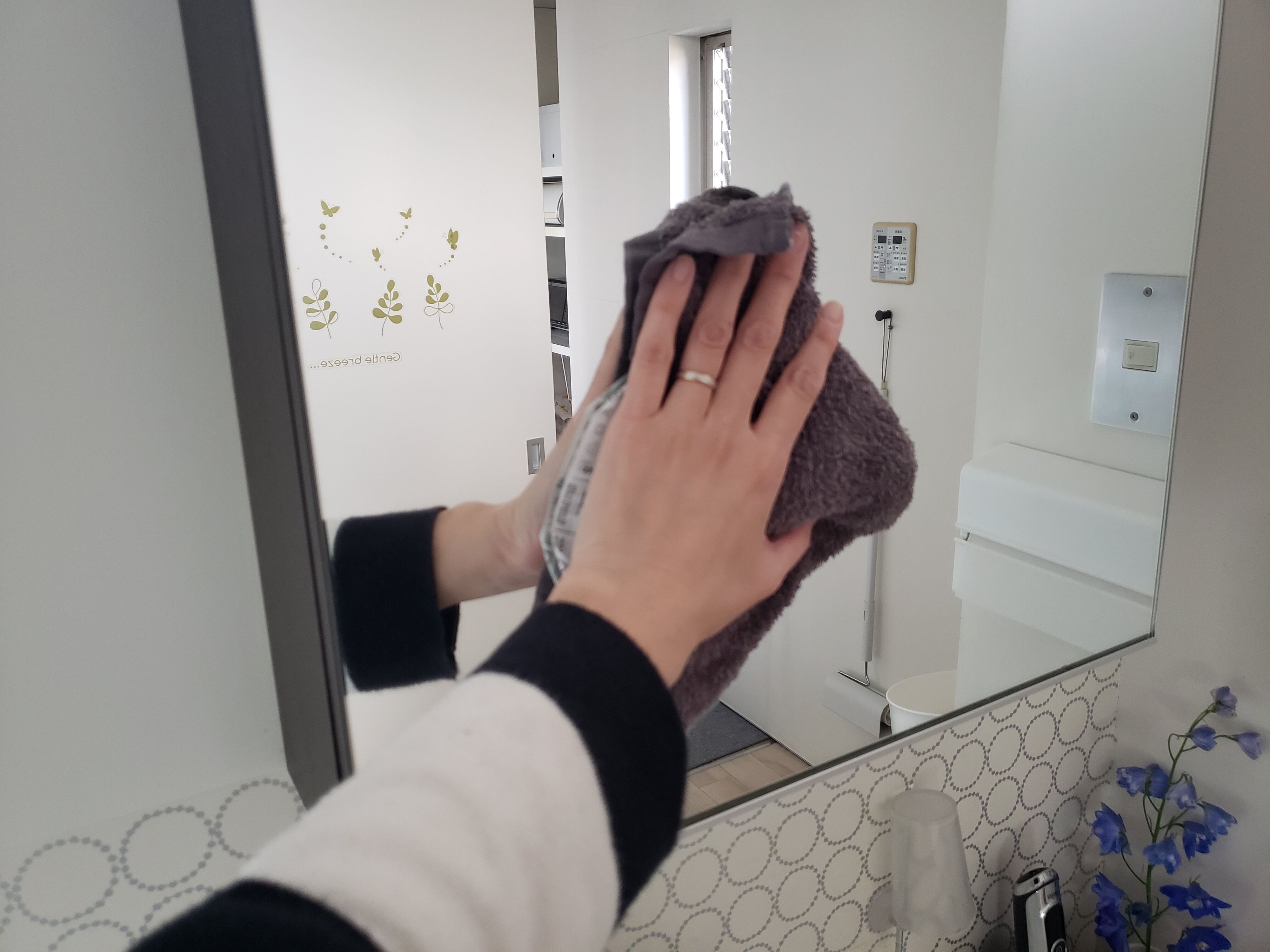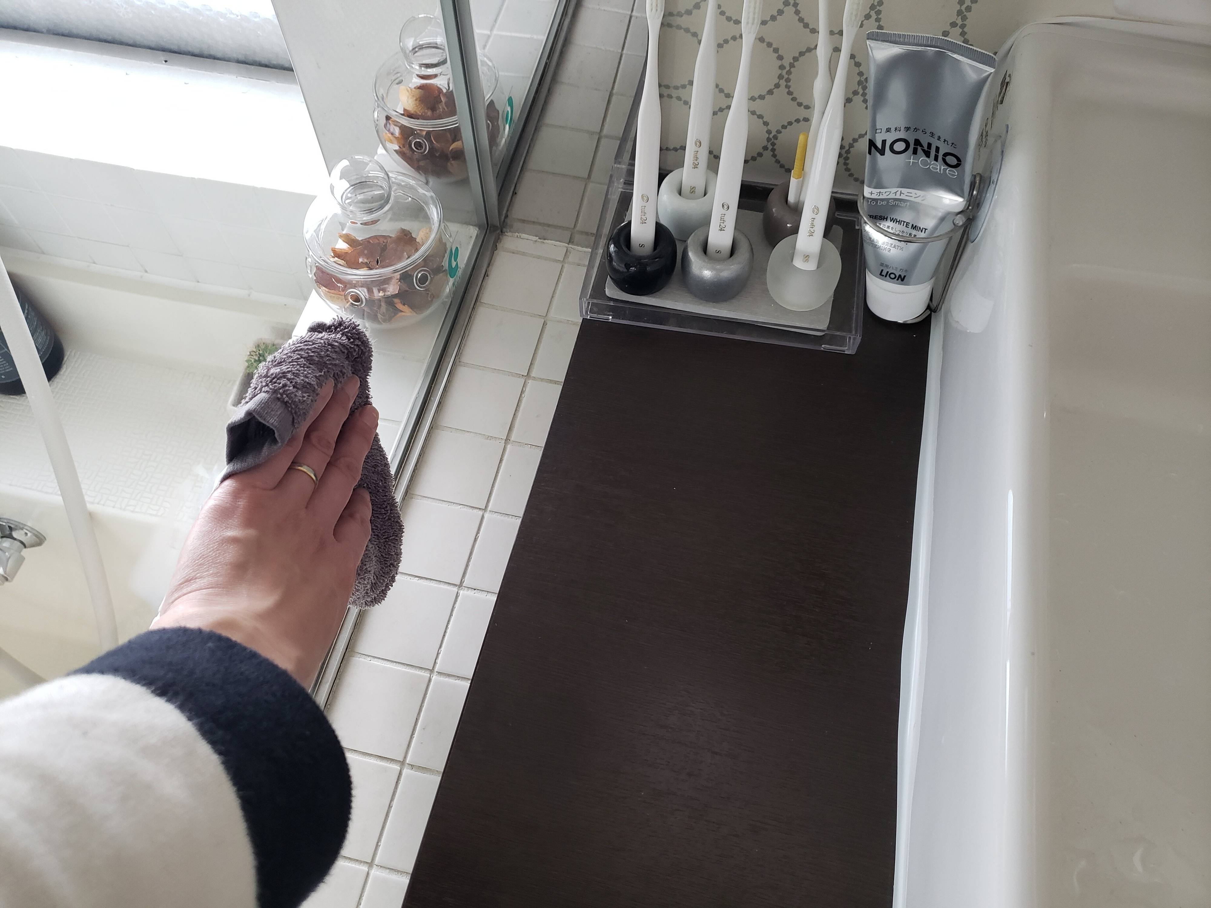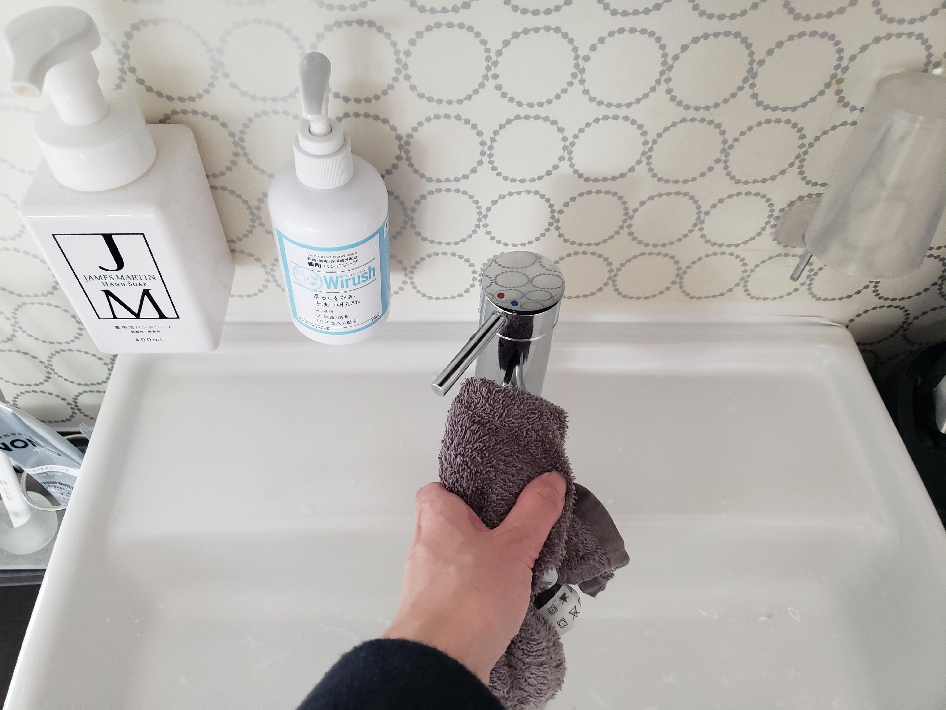 ほんのり湿り気のあるタオルは、鏡や洗面台周りに飛び散った水気を拭くのにちょうどいいんです!