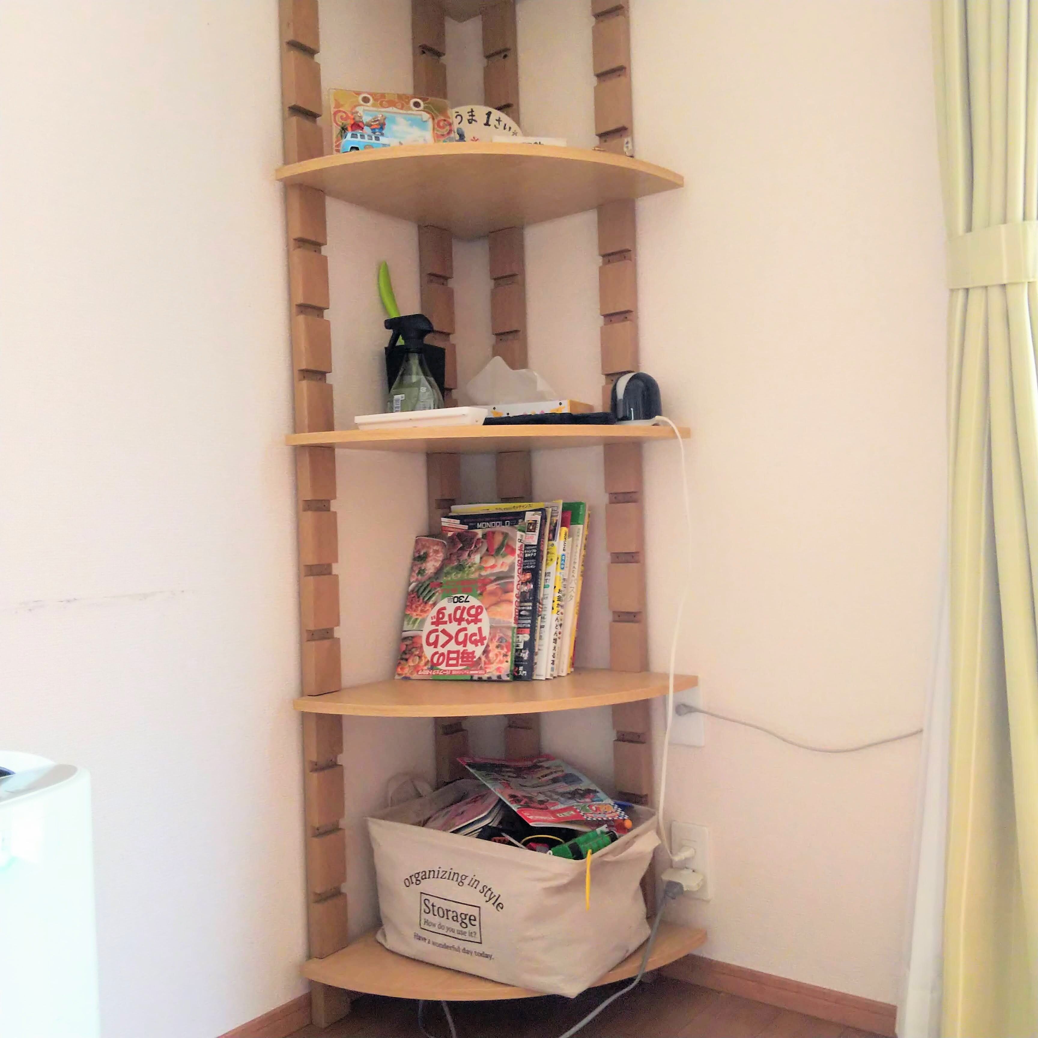 我が家にはこんな家具があります。雑誌や本を立てたい、写真を置きたい、小物を置きたいという願いを全て叶えてくれるということで夫がホームセンターで購入してきました。