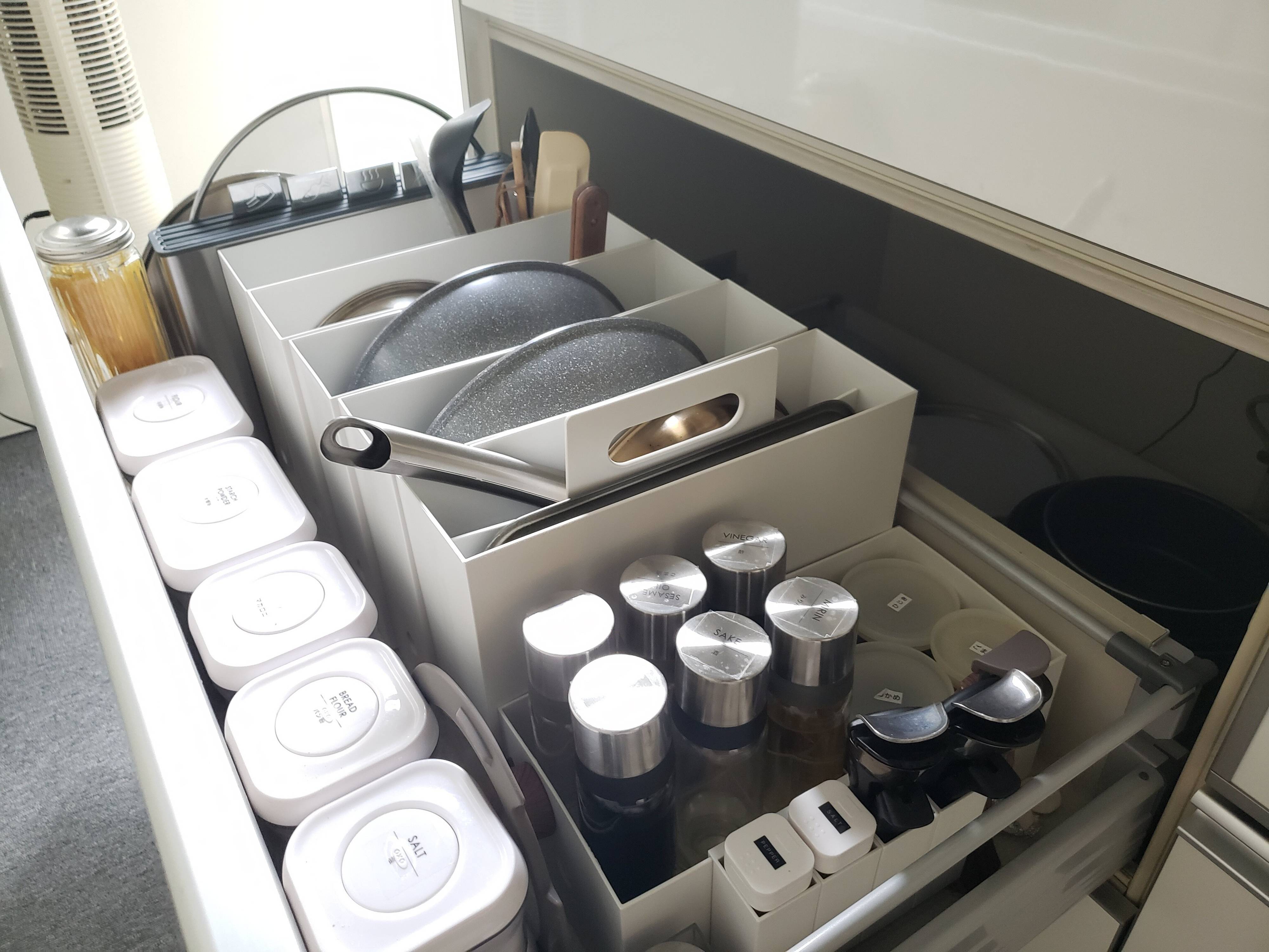 1つのフライパンに1つのファイルボックスと、贅沢にゆったりと収納することで、サッと出し入れできて、動きのムダを減らすことに成功しました!
