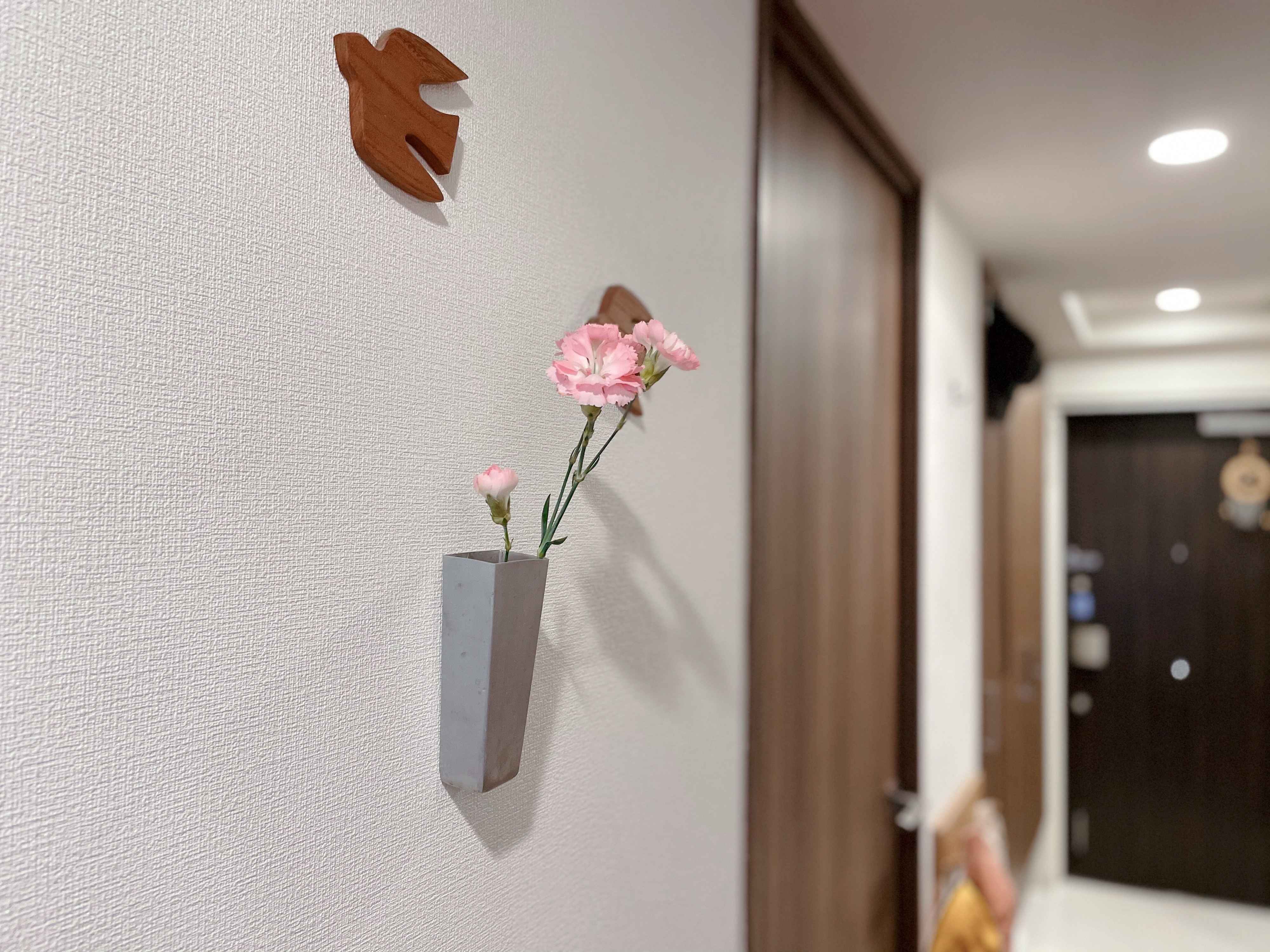 壁に掛けられるフラワーベースは、廊下用。