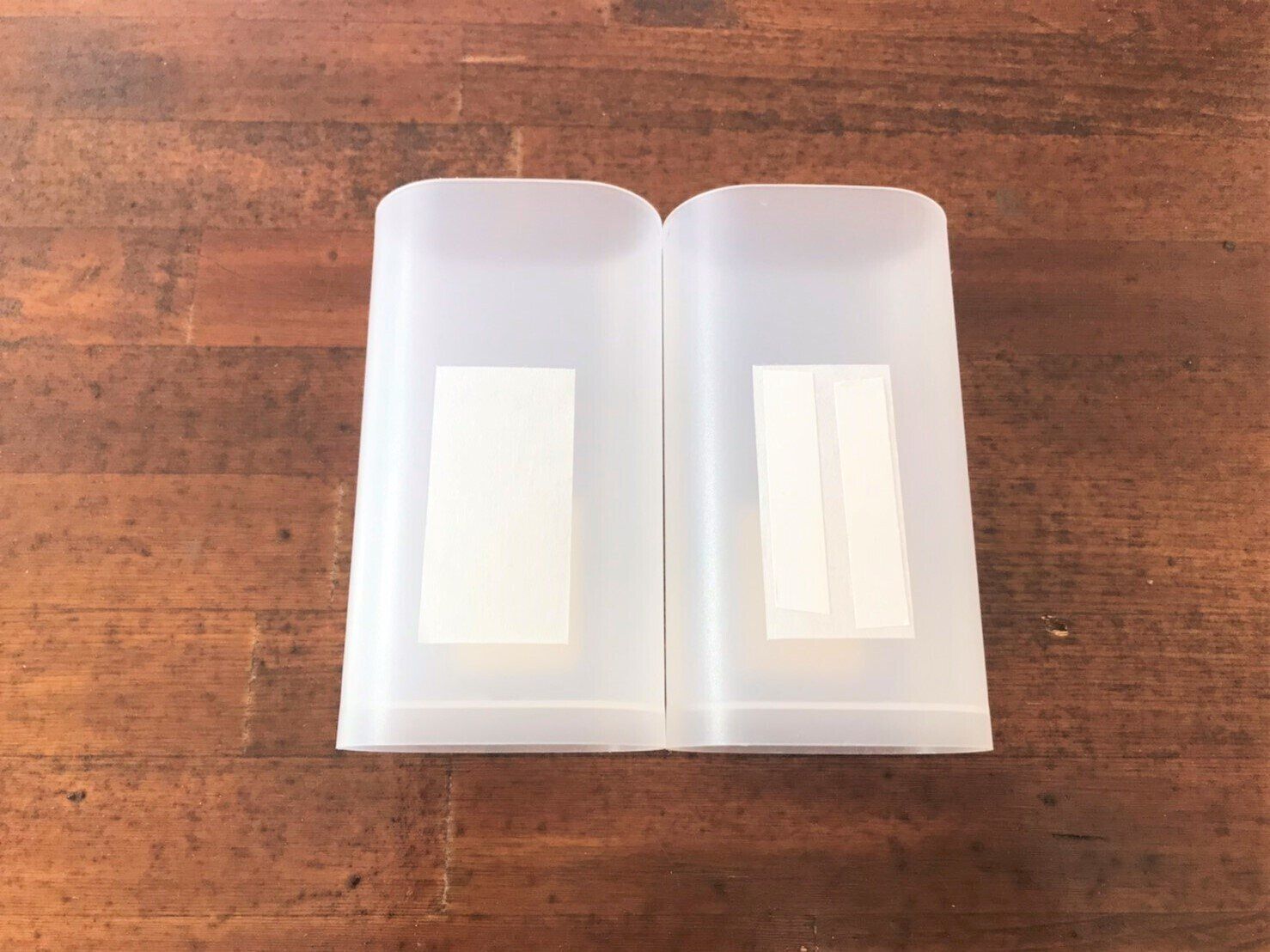 つくり方はとっても簡単!「メガネ・小物ケース」の側面をマスキングテープと両面テープを使って止めるだけです。直接両面テープを使わない理由は、万が一元に戻す際、剥がしたときに跡が残らないようにするためです。