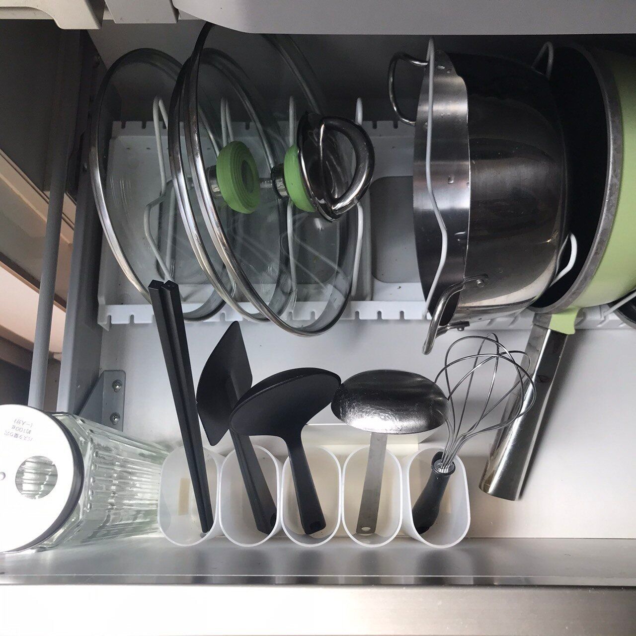 キッチンのIHコンロ下の引き出しに、収納するとこんな感じになります。1つのケースに1つの調理器具にこだわりました。その理由は、ひとつずつ収納することで、お互いに干渉しないので、必要なものだけをサッと取り出せるからです。