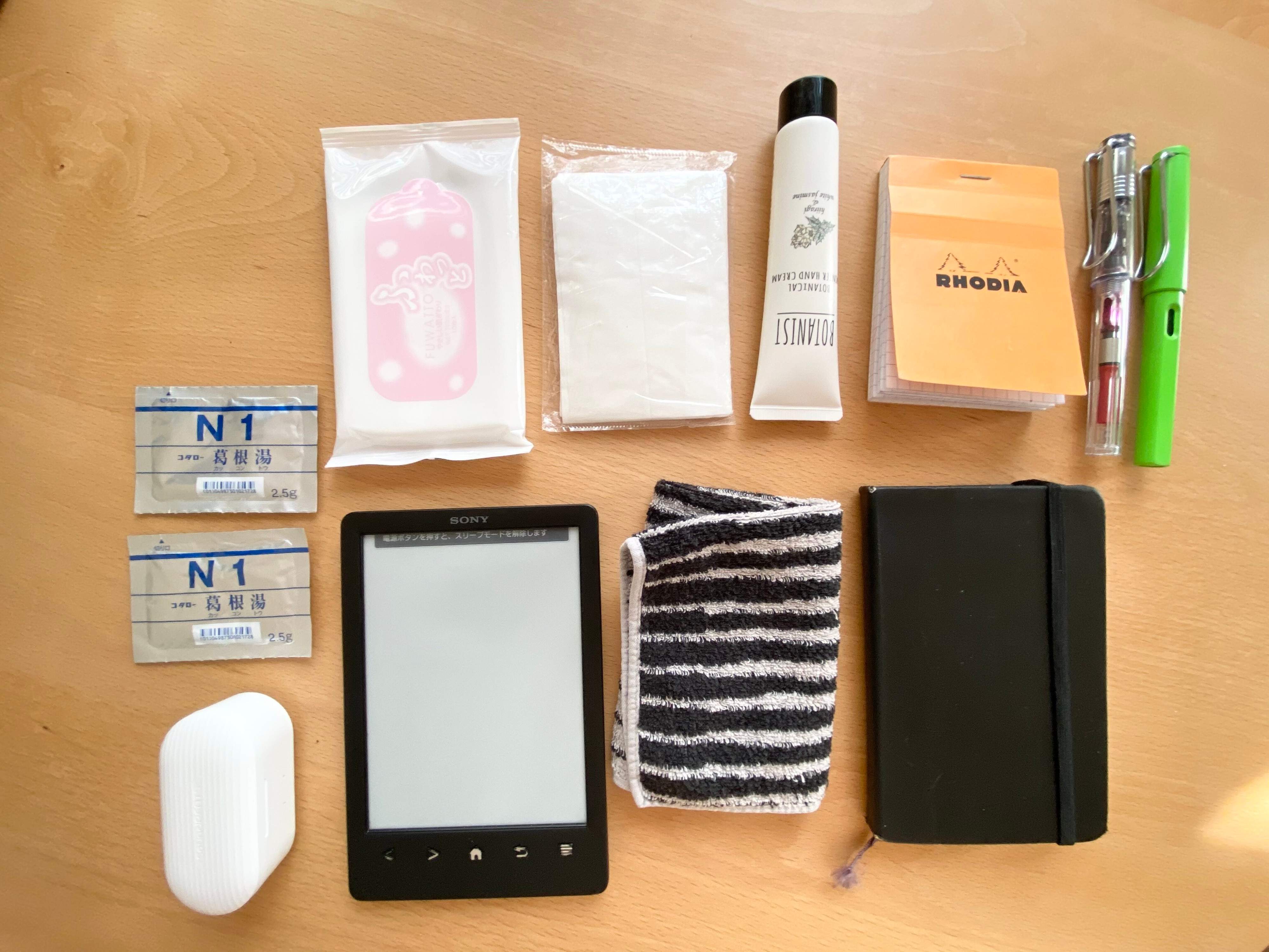主人がバッグを入れ替えても必ず持ち歩きたい持ち物が、ウェットシート、ティッシュ、ハンカチ、ハンドクリーム、メモ帳、ペン2本、手帳、ソニーリーダー、ワイヤレスイヤホンと薬。