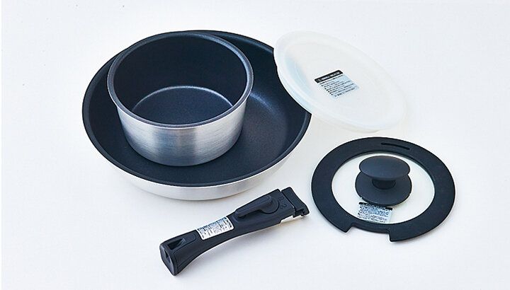 26cmフライパン、18cm鍋、18cmガラスふた&一時保存用ふた、専用着脱ハンドルのセット。¥5,990