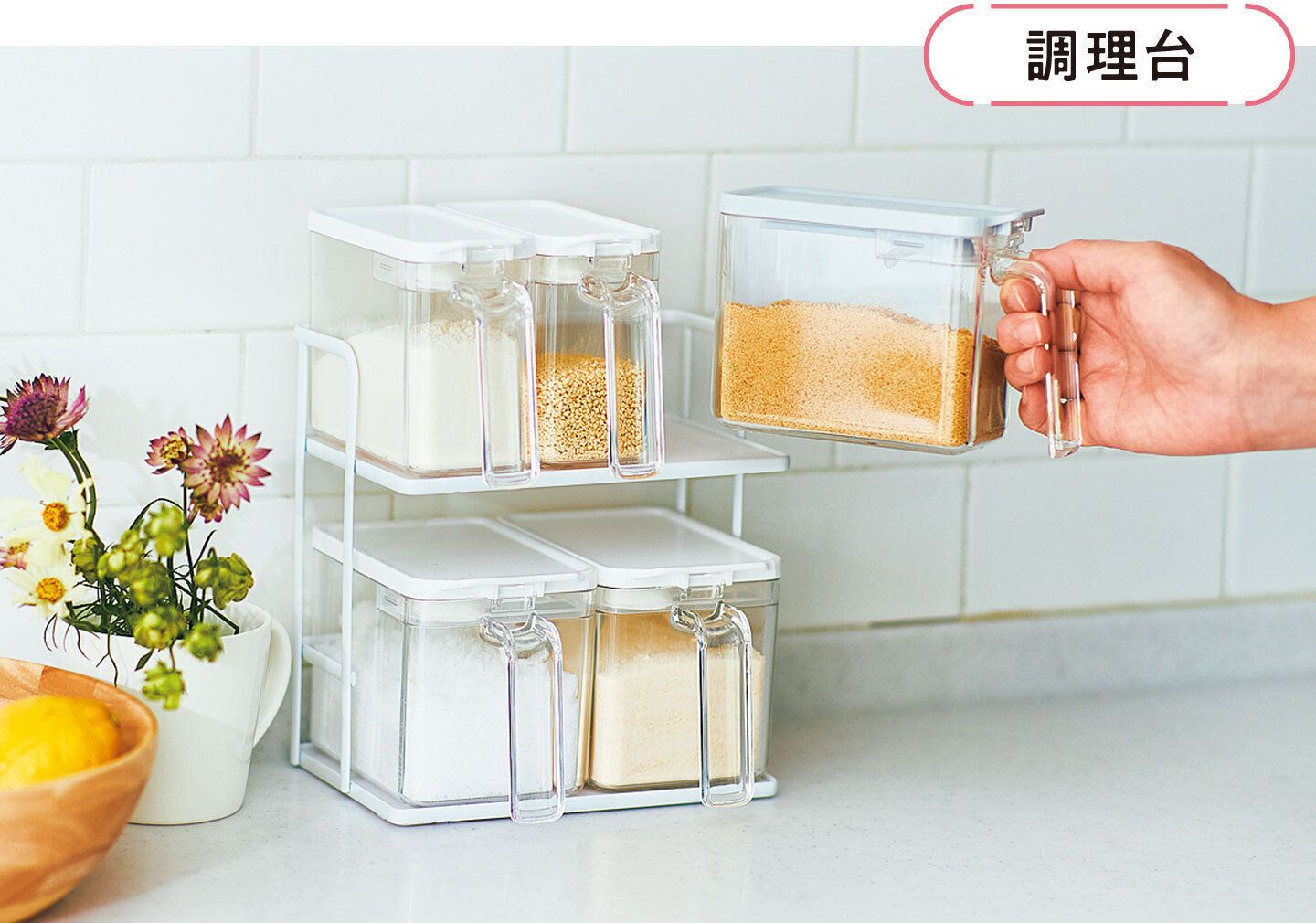 砂糖や塩、粉末だしなどは、ポットに詰め替えて調理中にすぐ手が届く場所にスタンバイ。ニトリならポットがラックにシンデレラフィットします。見た目もきれいで時短調理が実現!