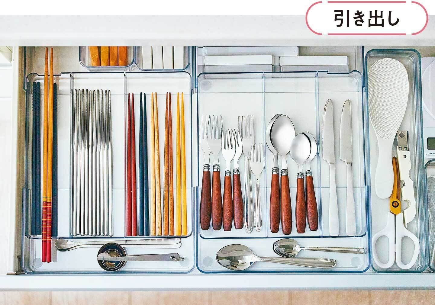 箸、スプーン、フォークなど、全てのアイテムに「個室」を用意してあげる感覚で、引き出し内に整理トレーを仕込みましょう。伸縮タイプならスペースにフィット♪