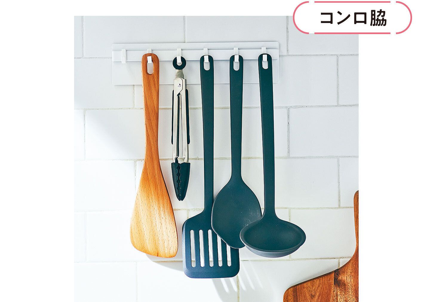 1軍のツールは鍋やフライパンを火にかけながらワンアクションで手に取れるコンロ脇を定位置に。浮かせることで掃除がラクにできます。2軍のツールはコンロ下の引き出しにしまうと◎