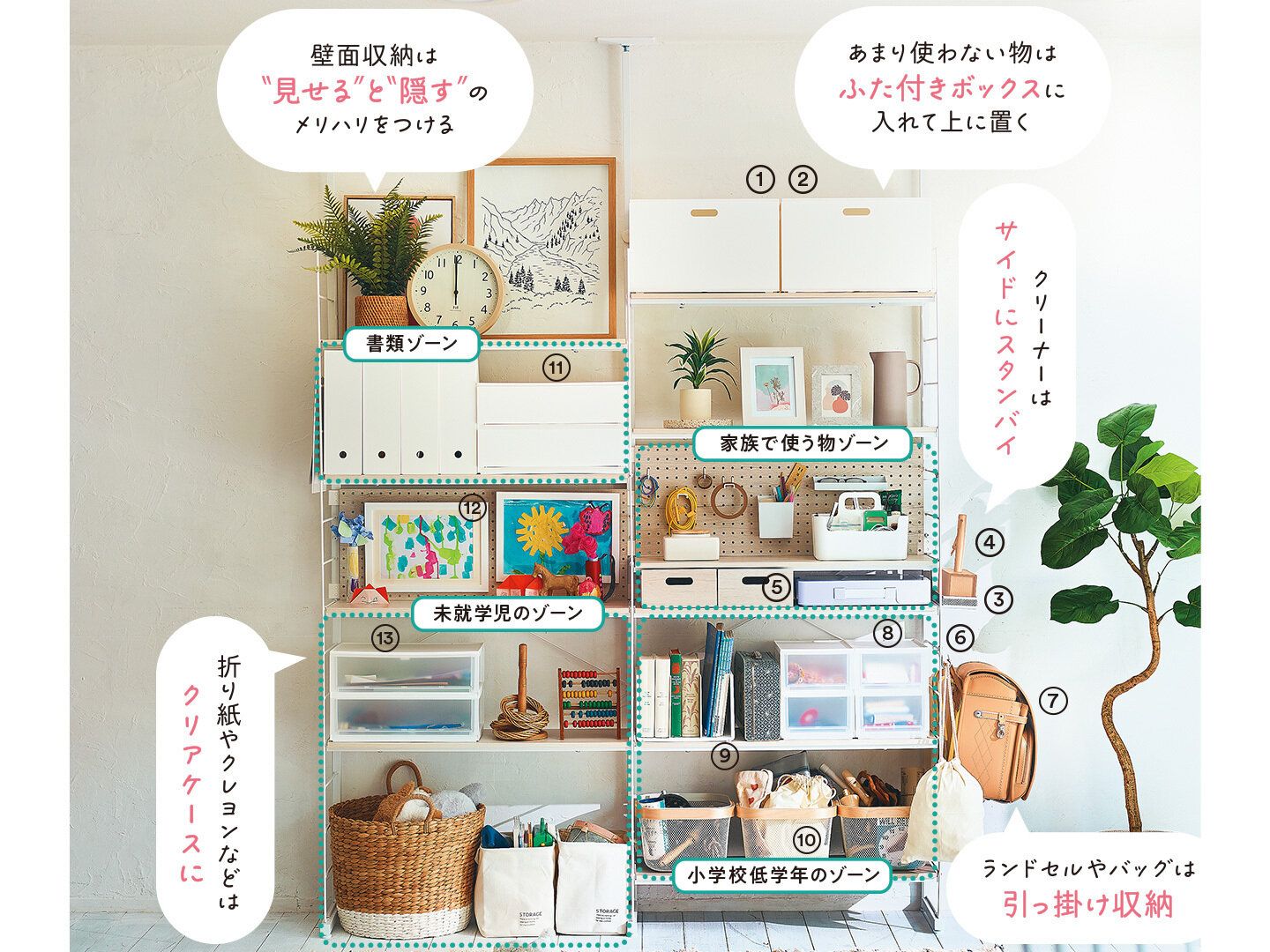 書類や日用品、おもちゃなど家族が使うさまざまな物が集まってくるリビング。壁面の広いスペースを使い、使う場面や使う人ごとにエリア分けして収納すれば、二度と散らからないシステムが完成。飾るスペースも作れば、見栄えもいい!
