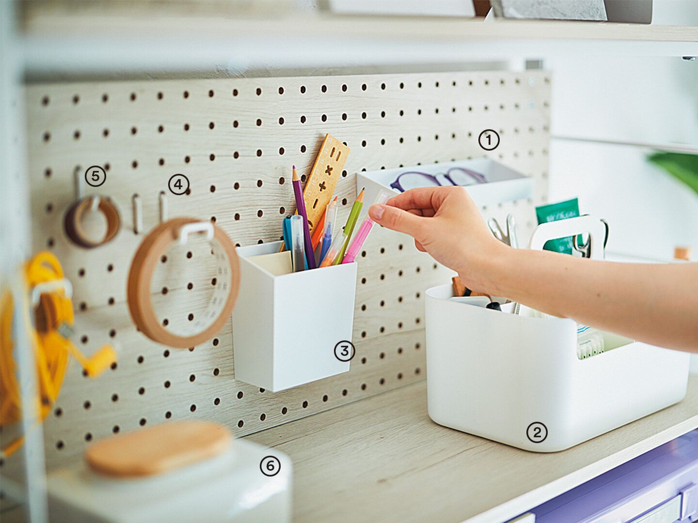 子どもも大人もよく使うペンやテープなどの文具は、サッと取り出せる引っ掛け収納に。パンチングボードなら自分好みにカスタマイズが可能! わかりやすい定位置を作ることで「あれ、どこに行った?」がなくなります