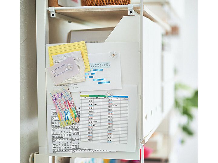 Nポルダのオプションであるマグネットプレートを側面に設置し、すぐチェックしたいプリント類の定位置に。用が済んだら捨てるか、すぐ横の棚に並べた「ファイルスタンド」にしまえば散らかりません