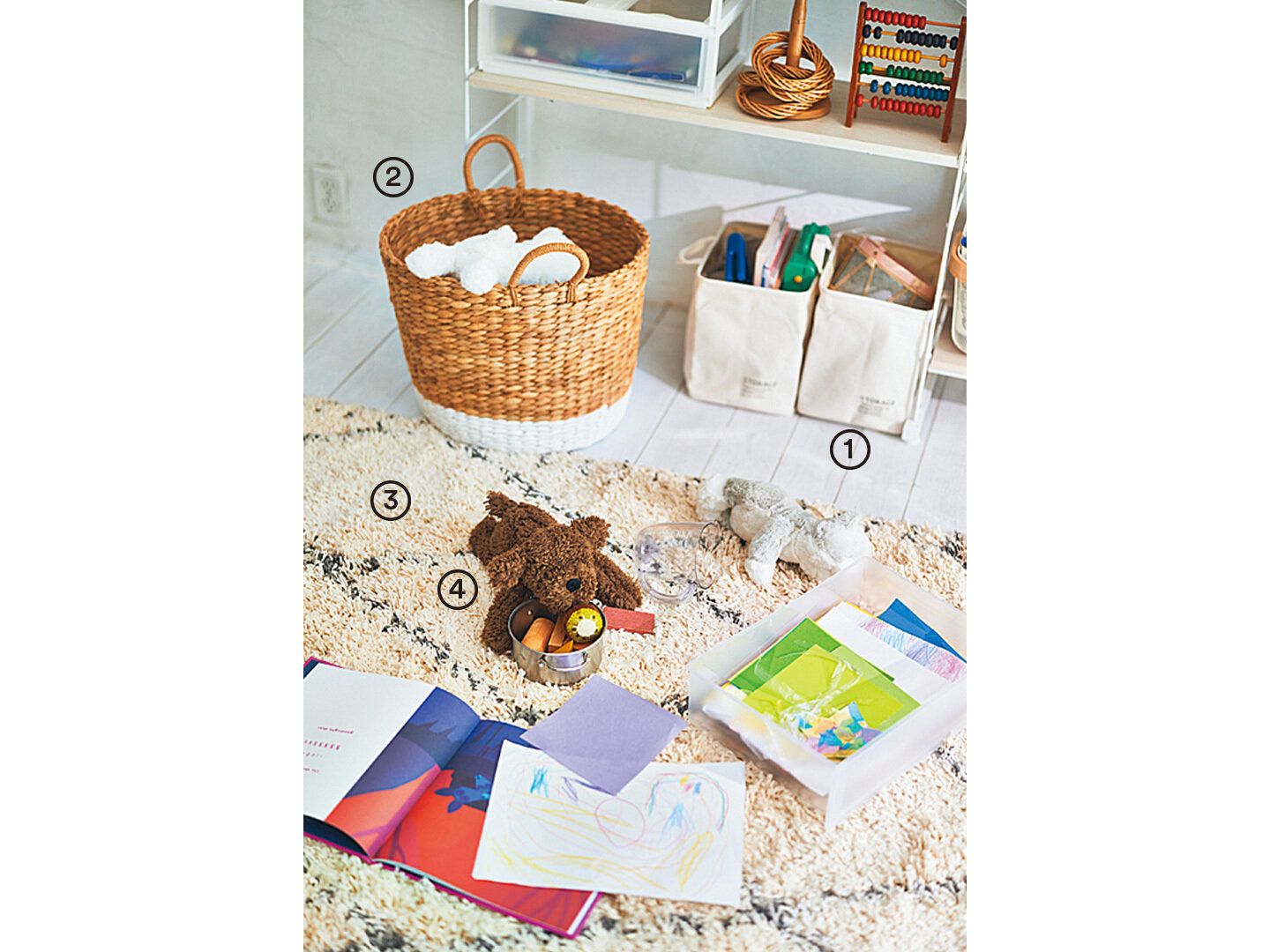 1.「バスケット」(W19×D26×H24㎝)各¥499、2.「バスケット」(W38×D38×H32㎝)¥2,990、3.「ラグ」(約W133×D190㎝)¥7,990、4.「ぬいぐるみ」各¥799