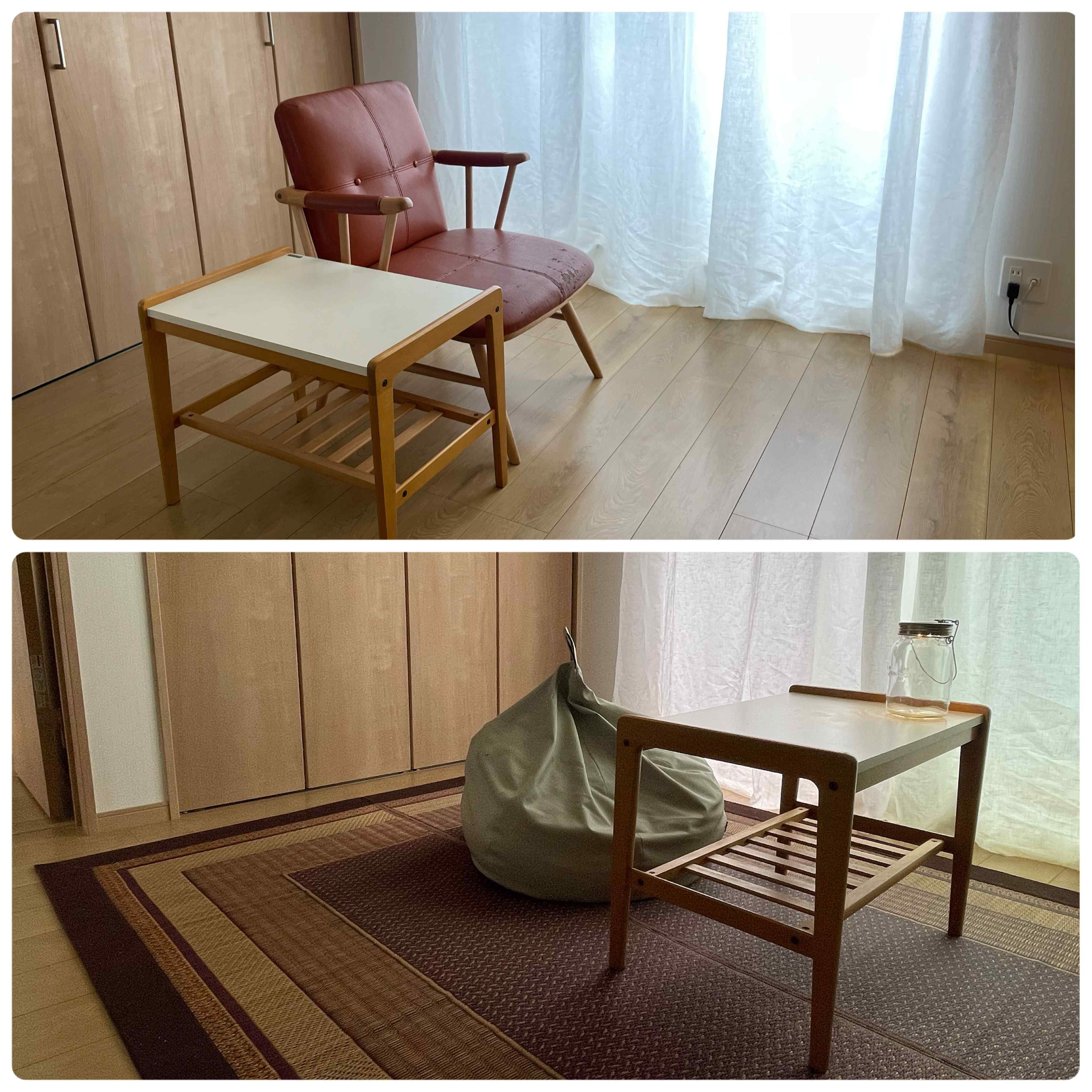 以前はスツールをテーブル代わりにしていたこともありますが、ロースタイルにはやや高めで、コーヒーくらいしか置けませんでした。