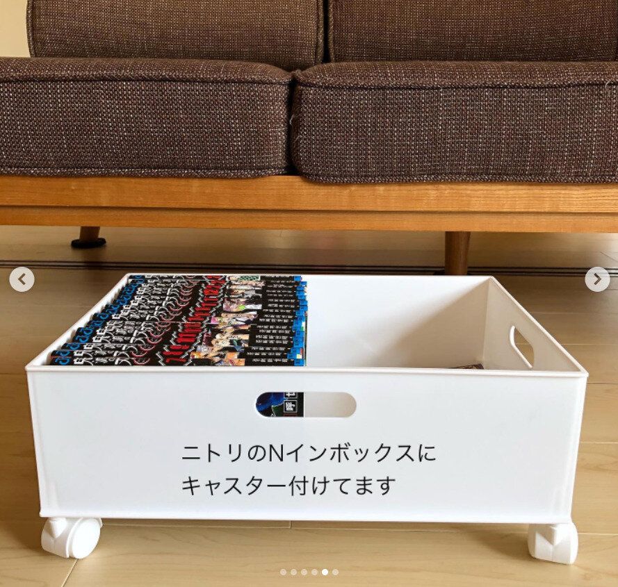 ニトリのNインボックスにキャスターをつけて漫画を収納する素敵なアイデアです!よく読む漫画はこのように定位置を決めて、ソファ下などのよく使う場所に収納しておくときれいをキープしやすくなりそうです!ボックスのデザインがシンプルなので、家具の下に配置してもナチュラルになじみます。