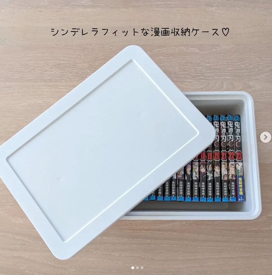 無印良品の「ポリプロピレン収納ボックス」に、「鬼滅の刃」全23巻がシンデレラフィット!中身が見えないカラーリングをチョイスすれば、インテリアとの兼ね合いも◎。別売りのフタを付けると漫画にホコリがかぶらず、日焼けもしないのがうれしいところです。よく使う場所に保管しておけば、すぐに取り出して見やすいのもよいですね!