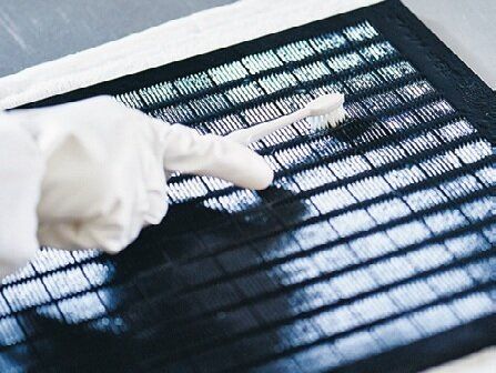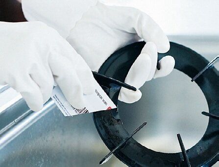 つけ置き後、残った汚れをカードやスポンジ、古歯ブラシでこすり洗いする。不要なプラスチック製カードを斜めに切って使うと◎。