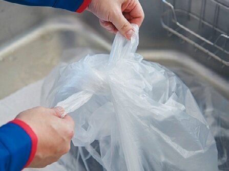 二重にしたポリ袋にはずしたフィルターを入れ、アルカリ電解水をスプレーする。約50℃の湯をひたひたに入れ、5~10分つけ置く。