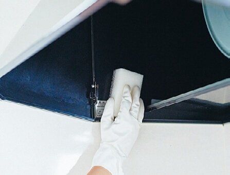 レンジフードは、アルカリ電解水を含ませたスポンジでこする。古タオルで湯拭きして汚れを拭き取り、別の古タオルでから拭きする。