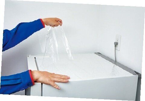 油分を含んだほこりがたまって掃除が大変な冷蔵庫の上は、掃除後にほこりの付着を防ぐためのラップをペタリ。汚れたら貼り替えればいいだけなので、掃除が格段にラクに!