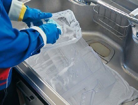 庫内の食材を出し、はずせるパーツを全て取りはずす。シンクに傷防止用の古タオルを敷き、食器用洗剤をつけたスポンジで洗う。