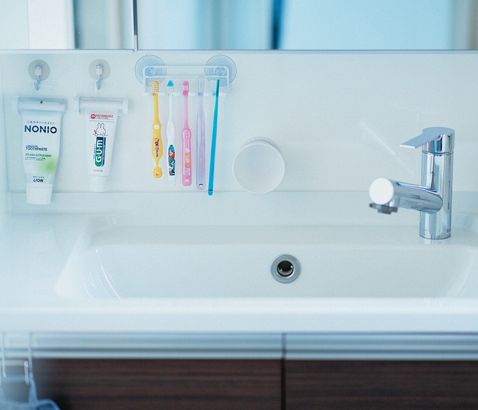 洗面台周りは極力物を置かず、掃除のしやすさ最優先に。頻繁に使う歯ブラシ、歯磨き粉、コップも、専用ホルダーを使って浮かせればぬめりなし。